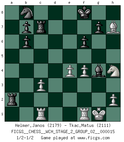 Last move : 1/2-1/2 2016 October 1 15:57:58 [Event "FICGS__CHESS__WCH_STAGE_2_GROUP_02__000015"] [Site "FICGS"] [Date "2016.08.04"] [Round "1"] [White "Helmer,Janos"] [Black "Tkac,Matus"] [Result "1/2-1/2"] [WhiteElo "2179"] [BlackElo "2111"] 1.c4 e5 2.Nc3 Nf6 3.g3 Bb4 4.Bg2 O-O 5.d3 Bxc3+ 6.bxc3 Re8 7.Nh3 c6 8.O-O d5 9.cxd5 cxd5 10.Bg5 Bf5 11.f4 e4 12.Bxf6 Qxf6 13.Qb3 Qc6 14.Ng5 Re7 15.dxe4 dxe4 16.g4 Bxg4 17.Bxe4 Qb6+ 18.Qxb6 axb6 19.Bxh7+ Kf8 20.e4 f6 21.Nf3 Rc7 22.Rac1 Rxa2 23.Nh4 1/2-1/2 English : Bremen, Smyslov system Kingside Castling by player Black (move 4) Kingside Castling by player White (move 8) This chess game ended in a draw. Follow this game move after move (download)There are two types of sacrifices: correct ones and mine. (Mikhail Tal) Schach verlangt totale Konzentration. (Robert James Fischer) Siempre es mucho mejor sacrificar las piezas de tu oponente. (Savielly Tartakover) La vérité est comme le meilleur coup aux échecs : elle existe, mais il faut la chercher. (Arturo Perez-Reverte) Creativity is allowing yourself to make mistakes. Art is knowing which ones to keep. (Scott Adams)