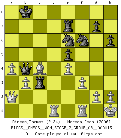 Last move : 1-0 2016 December 1 7:12:57 [Event "FICGS__CHESS__WCH_STAGE_2_GROUP_03__000015"] [Site "FICGS"] [Date "2016.08.04"] [Round "1"] [White "Dineen,Thomas"] [Black "Maceda,Coco"] [Result "1-0"] [WhiteElo "2124"] [BlackElo "2006"] 1.d4 d5 2.c4 c6 3.Nc3 Nf6 4.e3 e6 5.Bd3 Nbd7 6.Nf3 dxc4 7.Bxc4 b5 8.Bd3 Bb7 9.O-O a6 10.e4 c5 11.d5 Qc7 12.Qe2 c4 13.Bc2 Bd6 14.Bg5 O-O-O 15.dxe6 fxe6 16.Rad1 h6 17.Bd2 Kb8 18.Kh1 Rhe8 19.Nd4 Bc5 20.Be3 Nf8 21.Ndxb5 axb5 22.Nxb5 Qe7 23.f3 e5 24.Bd2 Ne6 25.Qxc4 Ba6 26.a4 Rc8 27.Bd3 Be3 28.Qa2 Bxd2 29.Rxd2 Qb4 30.b3 Re7 31.R2d1 Bxb5 32.Bxb5 Rc3 33.Bc4 1-0 This chess game has been lost on time (started : 2016.08.04 15:2:15) QGD Slav defense Kingside Castling by player White (move 9) Queenside Castling by player Black (move 14) Player White won this chess game. Follow this game move after move (download)The most important feature of the Chess position is the activity of the pieces. This is absolutely fundamental in all phases of the game: Opening, Middlegame and especially Endgame. The primary constraint on a piece's activity is the Pawn structure. (Michael Stean) Pläne sind die Träume des Verständigen. (Ernst Freiherr von Feuchtersleben) Todavía soy una víctima del Ajedrez. Tiene toda la belleza del arte y mucho mas. No puede ser comercializado. El Ajedrez es mas puro que el arte en su posición social. (Marcel Duchamp) Les échecs c'est le défi de l'alpiniste, toujours plus haut, prêt à tout pour monter à l'assaut du Roi ennemi. Les échecs, c'est de la musique en mouvement, un ballet majestueux pour les yeux. C'est de la poésie composée par les fantômes du passé qui au même titre que Rimbaud ou Verlaine méritent notre admiration. Les échecs, c'est de la peinture ou le moindre mouvement modifie le tableau pour en faire un Picasso ou un Van Gogh. Les échecs, c'est tout et rien, c'est la vie et la mort. Jjulie33 sur le forum de France-Echecs. Optimism is a variety of information deficit. Sometimes especially true for correspondence chess games. (Michael Aigner)