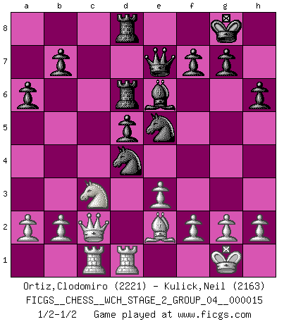 Last move : 1/2-1/2 2016 August 15 17:52:30 [Event "FICGS__CHESS__WCH_STAGE_2_GROUP_04__000015"] [Site "FICGS"] [Date "2016.08.04"] [Round "1"] [White "Ortiz,Clodomiro"] [Black "Kulick,Neil"] [Result "1/2-1/2"] [WhiteElo "2221"] [BlackElo "2163"] 1.d4 d5 2.Bf4 Nf6 3.e3 c5 4.dxc5 Nc6 5.Nf3 e6 6.c4 Bxc5 7.Nc3 O-O 8.Be2 Qe7 9.cxd5 Rd8 10.O-O exd5 11.Na4 Bd6 12.Bxd6 Rxd6 13.Nc3 a6 14.Rc1 Bd7 15.Qd3 h6 16.Rfd1 Rd8 17.Qc2 Be6 18.Qa4 Nd7 19.Nd4 Nde5 20.Qc2 Nxd4 1/2-1/2 Queen's pawn, Mason variation Kingside Castling by player Black (move 7) Kingside Castling by player White (move 10) This chess game ended in a draw. Follow this game move after move (download)There is only one thing Fischer does in Chess without pleasure: to lose ! (Boris Spassky) Im Internet Chess Club betrug mein Rating vorübergehend 3350 ELO-Punkte. (Sergej Karjakin) Cuando tengas duda... ¡juega al Ajedrez!. (Tevis) Les Cavaliers se révèlent fort utiles dans les positions fermées. D'habitude, les Fous sont un peu plus forts que les Cavaliers dans les positions ouvertes. Qu'on le veuille ou non, il restera toujours des exceptions ! There is a great deal of difference between an eager man who wants to read a book and a tired man who wants a book to read. (G.K. Chesterton)