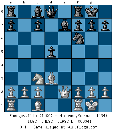 Last move : 0-1 2007 June 10 6:57:10 [Event "FICGS__CHESS__CLASS_E__000041"] [Site "FICGS"] [Date "2007.03.26"] [Round "1"] [White "Podogov,Ilia"] [Black "Miranda,Marcus"] [Result "0-1"] [WhiteElo "1400"] [BlackElo "1434"] 1.e4 e5 2.Nf3 Nc6 3.Nc3 Nf6 4.d4 exd4 5.Nxd4 Bb4 6.Nxc6 bxc6 7.Bd3 d5 8.exd5 cxd5 9.Qe2+ Be7 10.O-O O-O 0-1 Four knights : Scotch, 4...exd4 Kingside Castling by player White (move 10) Kingside Castling by player Black (move 10) Player Black won this chess game. Follow this game move after move (download)You must take your opponent into a deep dark forest where 2+2=5, and the path leading out is only wide enough for one. (Mikhail Tal) Das Schach hält seine Meister in eigenen Banden, Fesseln; auf vielerlei Weise formt es ihren Geist, so dass die innere Freiheit selbst des Stärksten beeinflusst wird. (Albert Einstein) Solo puedes ser bueno en el Ajedrez si amas al juego. (Bobby Fischer) Pour moi, les échecs ne sont pas un jeu mais un art. (Alexandre Alekhine) The difference between perseverance and obstinacy is that one comes from a strong will, and the other from a strong won't. (Henry Ward Beecher)