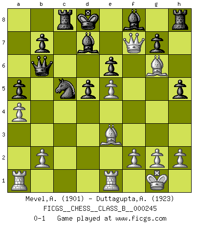 Last move : 0-1 2016 December 26 18:38:48 [Event "FICGS__CHESS__CLASS_B__000245"] [Site "FICGS"] [Date "2016.08.05"] [Round "1"] [White "Mevel,Alberic"] [Black "Duttagupta,Aniruddha"] [Result "0-1"] [WhiteElo "1901"] [BlackElo "1923"] 1.e4 e6 2.d4 d5 3.Nd2 Be7 4.Ngf3 Nf6 5.e5 Nfd7 6.c3 c5 7.Bd3 Nc6 8.O-O a5 9.Re1 cxd4 10.cxd4 Qb6 11.a4 Nxd4 12.Nxd4 Qxd4 13.Nf3 Qb6 14.Ng5 Nc5 15.Bc2 h5 16.Nxf7 Kxf7 17.Qf3+ Ke8 18.Bd2 Bd7 19.Bg6+ Kd8 20.Qf7 Bf8 21.Be3 Rc8 0-1 French : Tarrasch Kingside Castling by player White (move 8) Player Black won this chess game. Follow this game move after move (download)I like the moment when I break a man's ego. (Bobby Fischer) Jeder Fehler erscheint unglaublich dumm, wenn andre ihn begehen. (Georg Christoph Lichtenberg) El sobresalir en el Ajedrez es un signo de una mente intrigante. (Sir Arthur Conan Doyle) L'attaque fait le spectacle, la défense gagne les matchs. (Dicton footballistique) Always be a first-rate version of yourself, instead of a second-rate version of somebody else. (Judy Garland)