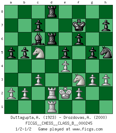 Last move : 1/2-1/2 2017 February 2 20:13:57 [Event "FICGS__CHESS__CLASS_B__000245"] [Site "FICGS"] [Date "2016.08.05"] [Round "1"] [White "Duttagupta,Aniruddha"] [Black "Drozdovas,Arturas"] [Result "1/2-1/2"] [WhiteElo "1923"] [BlackElo "2000"] 1.e4 e5 2.Nf3 Nc6 3.Bb5 a6 4.Ba4 Nf6 5.d3 Bc5 6.O-O b5 7.Bb3 d6 8.c3 O-O 9.Qe2 Bd7 10.Be3 Bxe3 11.Qxe3 Na5 12.Nbd2 Re8 13.h3 Nh5 14.d4 Qf6 15.dxe5 dxe5 16.Qg5 Qxg5 17.Nxg5 Nxb3 18.Nxb3 a5 19.Nc5 Bc6 20.Nf3 Rad8 21.Rfd1 Rd6 22.Rd2 Red8 23.Rad1 f6 24.g3 Kf7 25.Kf1 g5 26.Ke2 1/2-1/2 Ruy Lopez : Anderssen variation Kingside Castling by player White (move 6) Kingside Castling by player Black (move 8) This chess game ended in a draw. Follow this game move after move (download)Chess is a foolish expedient for making idle people believe they are doing something very clever when they are only wasting their time. (George Bernard Shaw) Du musst Deinen Gegner in einen tiefen dunklen Wald führen wo 2+2=5 ist und wo der Weg, der wieder hinausführt, nur breit genug für einen ist. (Mikhail Nekhemyevich Tal) Todos los jugadores de Ajedrez deberían tener un pasatiempo. (Savielly Tartakower) Les réformistes prétendent que les progrès de la théorie conduiront à la disparition des échecs, et qu'il faut, pour leur rendre vie, en remanier les règles. En réalité, qu'exprime cette affirmation? Le mépris de l'intuition, de l'imagination et de tous les autres éléments qui font des échecs un art. (Alexander Alekhine) Crush them ! Make them suffer ! (General Grievous in Star Wars ep.3)