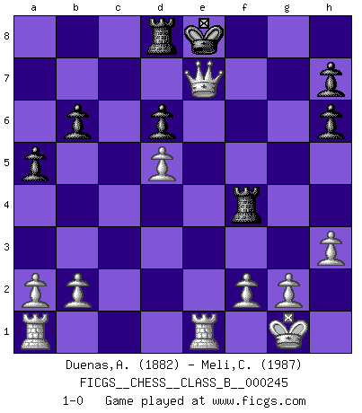 Last move : 1-0 2016 August 5 21:8:12 [Event "FICGS__CHESS__CLASS_B__000245"] [Site "FICGS"] [Date "2016.08.05"] [Round "1"] [White "Duenas,Alexis"] [Black "Meli,Cosimo Leonardo"] [Result "1-0"] [WhiteElo "1882"] [BlackElo "1987"] 1.d4 d5 2.c4 Nf6 3.Nf3 Nc6 4.cxd5 Nxd5 5.e4 Nf6 6.d5 Na5 7.Qa4+ Qd7 8.Qxa5 b6 9.Qd2 a5 10.Nc3 Ba6 11.Bxa6 Rxa6 12.e5 Ng4 13.h3 Nh6 14.Qe2 Ra8 15.Bxh6 gxh6 16.e6 fxe6 17.Ne5 Qd6 18.Qh5+ Kd8 19.Nf7+ Kd7 20.Nxd6 exd6 21.Qf7+ Be7 22.Qxe6+ Ke8 23.O-O Rd8 24.Rfe1 Rf8 25.Ne4 Rf4 26.Nxd6+ cxd6 27.Qxe7+ 1-0 QGD : Marshall defense Kingside Castling by player White (move 23) Player White won this chess game. Follow this game move after move (download)The enormous mental resilience, without which no Chess player can exist, was so much taken up by Chess that he could never free his mind of this game. (Albert Einstein) Bis zum Jahr 1971 verlief in meiner Schachkariere alles glatt. Dieses dramatische Match [Fischer-Taimanov 6:0] machte mein Leben zur Hölle. (Mark Taimanov) No hay otro maestro que tenga una voluntad terrífica de ganar. Al tablero, el irradía peligro y aún los oponentes mas fuertes tienden a congelarse como liebres cuando olfatean a una pantera. Aún sus debilidades son peligrosas. Con las blancas, su juego de apertura es predecible - te es posible hacer planes en su contra - pero es tan fuerte que tus planes casi nunca funcionan. En el juego medio, su precisión e invención son fabulosas y en finales, tú simplemente no le puedes vencer. (Experto Alemán anónimo) Celui qui prend des risques peut perdre, celui qui n'en prend pas perd toujours. (Xavier Tartacover) All maxims have their antagonist maxims; proverbs should be sold in pairs, a single one being but a half truth. (William Mathews)