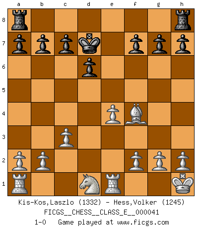 Last move : 1-0 2007 April 4 12:30:52 [Event "FICGS__CHESS__CLASS_E__000041"] [Site "FICGS"] [Date "2007.03.26"] [Round "1"] [White "Kis-Kos,Laszlo"] [Black "Hess,Volker"] [Result "1-0"] [WhiteElo "1332"] [BlackElo "1245"] 1.e4 d6 2.d4 Nf6 3.Nc3 e5 4.Nf3 Bg4 5.Be2 Be7 6.dxe5 Bxf3 7.exf6 Bxe2 8.fxe7 Bxd1 9.exd8Q+ Kxd8 10.Nxd1 Nc6 11.O-O Nd4 12.c3 Ne2+ 13.Kh1 Kd7 14.Re1 Nf4 15.Bxf4 1-0 Pirc defense Promotion Queen by player White (move 9) Kingside Castling by player White (move 11) Player White won this chess game. Follow this game move after move (download)The Pawns are the soul of the game. (Francois Andre Danican Philidor) Sicherlich können nur Meister einen Stil haben. Daß ein nicht-Meister auch nur ein einziges Mal in seinem Leben eine Partie folgerecht durchführte, habe ich niemals bemerkt. (Emanuel Lasker) Personalmente, yo prefiero mirar hacia el futuro en donde un programa de computadora gane el título mundial de Ajedrez. La humanidad necesita una lección de humildad. (Richard Dawkings) Je ne crois pas en la psychologie, je crois aux bons coups. (Robert Fischer) No, I am still playing. (Anatoly Karpov)