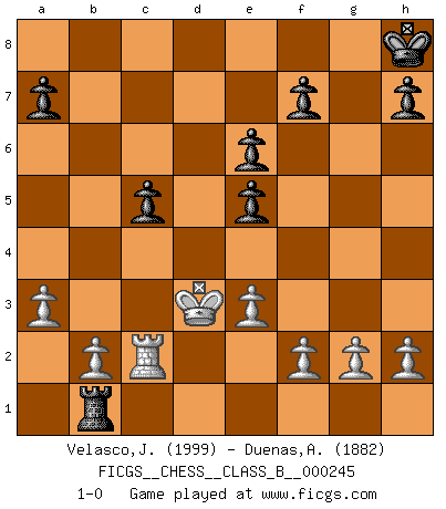 Last move : 1-0 2016 August 6 19:51:56 [Event "FICGS__CHESS__CLASS_B__000245"] [Site "FICGS"] [Date "2016.08.05"] [Round "1"] [White "Velasco,Jose Maria"] [Black "Duenas,Alexis"] [Result "1-0"] [WhiteElo "1999"] [BlackElo "1882"] 1.d4 Nf6 2.c4 e6 3.Nc3 Bb4 4.Qc2 O-O 5.a3 Bxc3+ 6.Qxc3 d5 7.Nf3 dxc4 8.Qxc4 b6 9.Bg5 Ba6 10.Qa4 c5 11.dxc5 bxc5 12.Rc1 Qb6 13.Bxf6 gxf6 14.Rc2 Rd8 15.e3 Bxf1 16.Rxf1 Rd5 17.Ke2 Nd7 18.Rd1 Rxd1 19.Kxd1 Rd8 20.Ke1 Ne5 21.Nxe5 fxe5 22.Qg4+ Kh8 23.Qe2 Qd6 24.Kf1 Qd1+ 25.Qxd1 Rxd1+ 26.Ke2 Rb1 27.Kd3 1-0 Nimzo-Indian : Classical variation Kingside Castling by player Black (move 4) Player White won this chess game. Follow this game move after move (download)In blitz, the Knight is stronger than the Bishop. (Vlastimil Hort) Wer sich die Fähigkeit anerziehen will im Schach selbstständig zu denken, der muß alles meiden, was leblos ist: ausgeklügelte Theorien, die sich auf sehr wenige Beispiele und eine Menge Hirngespinste stützen. (Emanuel Lasker) Bobby es la celebridad menos entendida y malinterpretada que camina el la faz de esta tierra. (Yasser Seirawan) L'ordinateur a tué l'originalité. Il n'y a plus guère d'aventures sur l'échiquier. (Jacob Murray) When you've done things right people won't know you've done anything at all. (Futurama)
