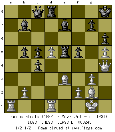 Last move : 1/2-1/2 2017 January 26 20:54:51 [Event "FICGS__CHESS__CLASS_B__000245"] [Site "FICGS"] [Date "2016.08.05"] [Round "1"] [White "Duenas,Alexis"] [Black "Mevel,Alberic"] [Result "1/2-1/2"] [WhiteElo "1882"] [BlackElo "1901"] 1.d4 d5 2.c4 e6 3.Nf3 c6 4.g3 dxc4 5.Bg2 b5 6.Ne5 Bb7 7.O-O a6 8.a4 Nf6 9.Nc3 Qc8 10.Bf4 Nbd7 11.Qc2 Be7 12.Nxd7 Qxd7 13.Ne4 Nxe4 14.Qxe4 O-O 15.Rfd1 Rad8 16.h4 Qc8 17.axb5 axb5 18.e3 Qd7 19.h5 h6 20.Be5 Rfe8 21.Qg4 Bf8 22.Bf4 Kh8 23.e4 Qc8 24.Be3 c5 25.d5 f5 26.exf5 exf5 27.Qf3 Re5 28.Qf4 Bd6 29.Qh4 Be7 30.Qf4 Bd6 31.Qh4 Be7 1/2-1/2 Queen's gambit declined Kingside Castling by player White (move 7) Kingside Castling by player Black (move 14) This chess game ended in a draw. Follow this game move after move (download)Chess is a terrible game. If you have no center, your opponent has a freer position. If you do have a center, then you really have something to worry about ! (Siegbert Tarrasch) Alle offensichtlichen Züge sehen nach dem Spiel in der Analyse verdächtig aus. (Viktor Kortschnoi) Nos gusta pensar. (Gary Kasparov) Ce qui est bien, c'est d'avoir tout un tas de pièces en prise : l'adversaire ne peut en prendre qu'une à la fois. Cité par Thierry Audin. They misunderestimated me. (George W. Bush, Bentonville nov. 6, 2000)