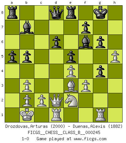 Last move : 1-0 2016 August 13 11:31:49 [Event "FICGS__CHESS__CLASS_B__000245"] [Site "FICGS"] [Date "2016.08.05"] [Round "1"] [White "Drozdovas,Arturas"] [Black "Duenas,Alexis"] [Result "1-0"] [WhiteElo "2000"] [BlackElo "1882"] 1.e4 c5 2.Nc3 Nc6 3.Nge2 g6 4.d4 cxd4 5.Nxd4 Bg7 6.Be3 Nf6 7.Bc4 O-O 8.Bb3 d6 9.f3 a6 10.Qd2 Na5 11.h4 h5 12.O-O-O Re8 13.Kb1 b5 14.Nd5 Bb7 15.Nxf6+ Bxf6 16.Rhg1 e5 17.Ne2 Nxb3 18.axb3 a5 19.g4 hxg4 20.h5 1-0 Sicilian : chameleon variation Kingside Castling by player Black (move 7) Queenside Castling by player White (move 12) Player White won this chess game. Follow this game move after move (download)A bad plan is better than none at all. (Frank Marshall) Dein Körper muss in Topform sein. Dein Schach verfällt, wenn dein Körper verfällt. Der Körper kann nicht vom Geist getrennt werden. (Robert James Fischer) Botvinnik trató de alejar el misterio referente al Ajedrez, siempre relacionandolo a situaciones de la vida diaria. Solía llamar al Ajedrez un problema inexacto típico, similar a aquellos en que la gente tiene siempre que resolver a cada día. (Garry Kasparov) C'est la seule position que je connaisse où les deux camps sont mals. Propos prêtés à V. Anand. To steal ideas from one person is plagiarism. To steal from many is research. (Unknown)