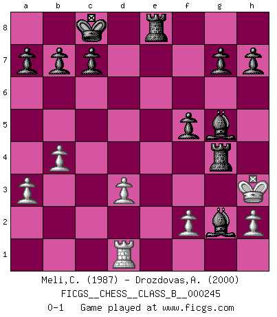 Last move : 0-1 2016 August 16 18:35:56 [Event "FICGS__CHESS__CLASS_B__000245"] [Site "FICGS"] [Date "2016.08.05"] [Round "1"] [White "Meli,Cosimo Leonardo"] [Black "Drozdovas,Arturas"] [Result "0-1"] [WhiteElo "1987"] [BlackElo "2000"] 1.e4 e5 2.d4 exd4 3.Qxd4 Nc6 4.Qc4 Nf6 5.Bd3 d5 6.exd5 Nxd5 7.Nf3 Qe7+ 8.Kf1 Be6 9.Ne5 Nxe5 10.Qd4 Nxd3 11.cxd3 Qb4 12.Qxb4 Nxb4 13.a3 Nc2 14.Ra2 Bxa2 15.Nc3 Be6 16.Ke2 Nd4+ 17.Ke3 O-O-O 18.Ne4 f5 19.Ng5 Bb3 20.Nf7 Bxf7 21.b4 Be7 22.Bb2 Rhe8 23.Bxd4 Bg5+ 24.Kf3 Rxd4 25.Rd1 Bd5+ 26.Kg3 Rg4+ 27.Kh3 Bxg2+ 0-1 Centre game : Hall variation Queenside Castling by player Black (move 17) Player Black won this chess game. Follow this game move after move (download)It is always better to sacrifice your opponent's men. (Savielly Tartakower) Meine Liebe ist Schach, Schach, Schach. Ich muss jeden Tag Schach spielen, deshalb fühle ich mich so stark. (Miguel Najdorf) En la perfecta combinación de Ajedrez como en una historia corta de primera clase, toda la trama y contra trama deberá conducir hacia un final sorprendente, el interes no es mitigado hasta el último momento. (Yates and Winter) Toutes choses étant égales, c'est la conviction qui gagne. Alliée à une volonté de vaincre, elle sert de détonateur, suscite des idées, disperse les doutes et aide à penser clairement. (Robert Fischer) Good luck. You're gonna need it. (Han Solo in Star Wars ep.6)