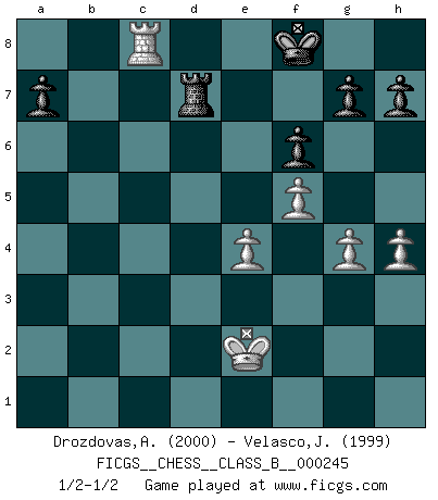 Last move : 1/2-1/2 2016 October 23 13:5:38 [Event "FICGS__CHESS__CLASS_B__000245"] [Site "FICGS"] [Date "2016.08.05"] [Round "1"] [White "Drozdovas,Arturas"] [Black "Velasco,Jose Maria"] [Result "1/2-1/2"] [WhiteElo "2000"] [BlackElo "1999"] 1.d4 Nf6 2.c4 e6 3.e3 d5 4.Nf3 c6 5.b3 c5 6.Bb2 cxd4 7.Nxd4 Bb4+ 8.Nd2 O-O 9.a3 Be7 10.Be2 Nc6 11.O-O Nxd4 12.Bxd4 b6 13.b4 Bb7 14.Rc1 Rc8 15.Qa4 Qd7 16.Qxd7 Nxd7 17.cxd5 Bxd5 18.Ba6 Rxc1 19.Rxc1 Rd8 20.Kf1 f6 21.e4 Nb8 22.Bc8 Ba2 23.Be3 Bd6 24.f4 e5 25.f5 Bf7 26.Kf2 Kf8 27.g4 Be7 28.Ke2 Be8 29.Be6 Nc6 30.Nf3 Bd6 31.h4 Nd4+ 32.Nxd4 exd4 33.Bxd4 Bxb4 34.Bxb6 Bxa3 35.Bc5+ Bxc5 36.Rxc5 Bd7 37.Bxd7 Rxd7 38.Rc8+ 1/2-1/2 Queen's pawn game Kingside Castling by player Black (move 8) Kingside Castling by player White (move 11) This chess game ended in a draw. Follow this game move after move (download)If you aren't afraid of Spassky, then I have removed the element of money. (Jim Slater) Mit sehr nachdenklichem Gesicht schreitet Bobby durch den Turniersaal. Was ist passiert?, fragt Lombardy. Ich stehe schlecht, antwortet Fischer. Lombardy: Dann biete doch einfach Remis an. Fischer: So schlecht stehe ich nun auch wieder nicht! (Robert James Fischer) En un gambito tu regalas un Peón por el bién de tomar un juego perdido. (Samuel Standige Boden) Je menace de comprendre la position. (Anonyme) Perhaps chess is the wrong game for the times (The Chess Master and the Computer, by Garry Kasparov - 2010)