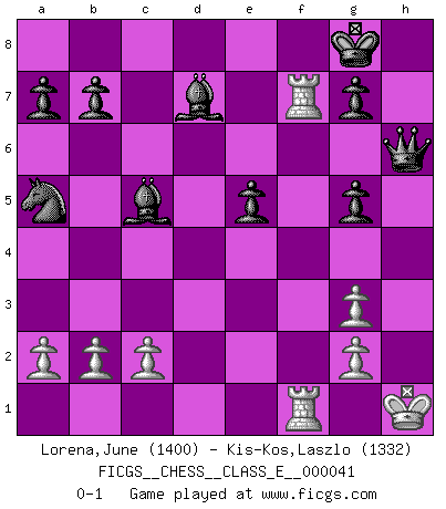 Last move : 0-1 2007 May 18 6:8:21 [Event "FICGS__CHESS__CLASS_E__000041"] [Site "FICGS"] [Date "2007.03.26"] [Round "1"] [White "Lorena,June"] [Black "Kis-Kos,Laszlo"] [Result "0-1"] [WhiteElo "1400"] [BlackElo "1332"] 1.d4 Nf6 2.Nc3 d5 3.e4 dxe4 4.f3 exf3 5.Nxf3 e6 6.Bf4 Bb4 7.Bd3 O-O 8.O-O c5 9.Nb5 Nc6 10.Nc7 Rb8 11.Ne8 Rxe8 12.Bxb8 Nxb8 13.dxc5 Bxc5+ 14.Kh1 Nc6 15.Qe1 Bd7 16.Qh4 h6 17.Rad1 e5 18.Ng5 hxg5 19.Qg3 Nh5 20.Bc4 Nxg3+ 21.hxg3 Re7 22.Rf3 Qb6 23.Rdf1 Na5 24.Bxf7+ Rxf7 25.Rxf7 Qh6+ 0-1 Queen's pawn game Kingside Castling by player Black (move 7) Kingside Castling by player White (move 8) Player Black won this chess game. Follow this game move after move (download)We don't really know how the game was invented, though there are suspicions. As soon as we discover the culprits, we'll let you know. (Bruce Pandolfini) Um dein Spiel zu verbessern musst du zuallererst das Endspiel studieren, denn diese kann unabhängig studiert werden. Die Eröffnung und das Mittelspiel müssen immer in Bezug gesetzt werden zum Endspiel. (José Raúl Capablanca) Ciertamente el estado mental actual de Bobby Fischer es una tragedia. Uno de los mas grandes jugadores de Ajedrez del mundo -el orgullo y pena del Ajedrez Americano. (Frank Brady) Même si l'adversaire joue le coup analysé précédemment, recommencez l'analyse en voyant la nouvelle position. Première règle de Blumenfeld If you are going through hell, keep going. (Winston Churchill)