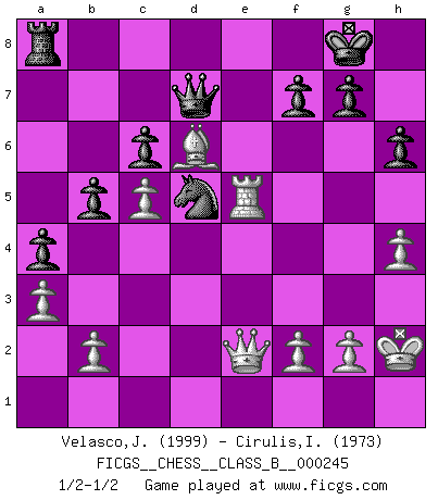 Last move : 1/2-1/2 2016 September 21 12:52:36 [Event "FICGS__CHESS__CLASS_B__000245"] [Site "FICGS"] [Date "2016.08.05"] [Round "1"] [White "Velasco,Jose Maria"] [Black "Cirulis,Ilmars"] [Result "1/2-1/2"] [WhiteElo "1999"] [BlackElo "1973"] 1.d4 a6 2.c4 e6 3.Nc3 d5 4.cxd5 exd5 5.Nf3 Nf6 6.Bg5 Be7 7.e3 h6 8.Bf4 Bf5 9.Qb3 Ra7 10.Ne5 O-O 11.Bd3 Bxd3 12.Nxd3 c6 13.O-O Nbd7 14.h3 a5 15.Rfd1 Re8 16.Rac1 Nf8 17.Nc5 Bxc5 18.dxc5 Ne6 19.Bd6 a4 20.Qb4 Qa8 21.e4 Nxe4 22.Nxe4 dxe4 23.Re1 Ng5 24.h4 Nh7 25.Rxe4 Nf6 26.Rxe8+ Qxe8 27.Re1 Qc8 28.Qd4 Nd5 29.a3 Ra5 30.Be5 Qf8 31.Bd6 Qd8 32.Qg4 Ra8 33.Re5 b5 34.Qe2 Qd7 35.Kh2 1/2-1/2 Queen's pawn Kingside Castling by player Black (move 10) Kingside Castling by player White (move 13) This chess game ended in a draw. Follow this game move after move (download)A player surprised is half beaten. (Proverb) Kasparov ist eine Art Monster mit hundert Augen, denen auch nicht das Geringste entgeht. (Tony Miles) Nunca nadie ha ganado una partida de Ajedrez rindiendose. (Unknown) J'ai vu le vaincu d'Echecs jouer des années durant dans l'espoir de la fête de la victoire. Car tu es plus riche de ce qu'elle existe si même elle n'est point pour toi. Ainsi de la perle du fond des mers. (Antoine de Saint-Exupéry) Those parts of the system that you can hit with a hammer (not advised) are called hardware; those program instructions that you can only curse at are called software. (Anonymous)