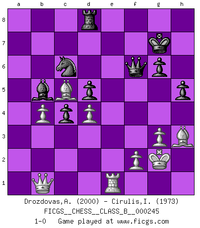 Last move : 1-0 2016 October 8 12:37:45 [Event "FICGS__CHESS__CLASS_B__000245"] [Site "FICGS"] [Date "2016.08.05"] [Round "1"] [White "Drozdovas,Arturas"] [Black "Cirulis,Ilmars"] [Result "1-0"] [WhiteElo "2000"] [BlackElo "1973"] 1.e4 a6 2.d4 e6 3.Nf3 d5 4.Nc3 Nf6 5.Bd3 c5 6.O-O c4 7.Be2 Bb4 8.exd5 exd5 9.Bg5 Bxc3 10.bxc3 Qd6 11.Nd2 O-O 12.Bf3 Ne8 13.Re1 Nc6 14.Nf1 h6 15.Bc1 Nf6 16.a4 Qc7 17.Ba3 Rd8 18.Ng3 b6 19.Nh5 Nxh5 20.Bxh5 Bf5 21.Bf3 b5 22.axb5 axb5 23.Bc5 Rxa1 24.Qxa1 Bxc2 25.Qb2 Ba4 26.h3 Qf4 27.Re3 g6 28.Qa3 Kg7 29.g3 Qf5 30.Bb6 Ra8 31.Kg2 b4 32.cxb4 Ra6 33.Bc5 Bb5 34.Qc1 Ra8 35.Re1 Rd8 36.h4 Qf6 37.h5 Qf5 38.hxg6 fxg6 39.Bd1 Qg5 40.Qb1 Qf6 41.Bg4 h5 42.Bh3 1-0 St. George (Baker) defense Kingside Castling by player White (move 6) Kingside Castling by player Black (move 11) Player White won this chess game. Follow this game move after move (download)You know you're going to lose. Even when I was ahead I knew I was going to lose. - On playing against Fischer. (Andrew Soltis) Privat ist Kortschnoi kein schlechter Mensch, sehr sympathisch. Aber während des Spiels ist er grausam. Er will dich töten. (Miguel Najdorf) Una compensación adecuada por un sacrificio es tener una combinación sólida que conduce a una posición ganadora; una compensación adecuada por una metida de pata es dejar a tu oponente arrebatar una derrota de las fauces de la victoria. (Bruce A. Moon) Même si vous avez un bon coup à faire, regardez toujours s'il n'y en a pas un qui lui soit préférable. (Pedro Damiano) Somehow our devils are never quite what we expect when we meet them face to face. (Nelson DeMille)