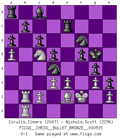 Last move : 0-1 2016 August 5 16:25:42 [Event "FICGS__CHESS__BULLET_BRONZE__000915"] [Site "FICGS"] [Date "2016.08.05"] [Round "1"] [White "Cirulis,Ilmars"] [Black "Nichols,Scott"] [Result "0-1"] [WhiteElo "2047"] [BlackElo "2296"] 1.b4 d6 2.Nf3 e5 3.Nc3 f5 4.e3 Nf6 5.a4 e4 6.Nd4 d5 7.Ba3 c6 8.a5 Bd6 9.Be2 O-O 10.f4 exf3 11.Bxf3 Qe7 12.O-O Bxb4 13.Qc1 Bxa3 14.Qxa3 Qxa3 15.Rxa3 g6 16.Rb1 Rf7 17.Na4 Nbd7 18.d3 Ne5 19.Nc5 Ne8 20.Rab3 Nd6 21.Kf2 Re7 22.Rb4 Kf7 23.R4b3 Kf6 24.Na4 g5 25.Nc5 g4 26.Be2 Nd7 27.Na4 Kg5 28.g3 h5 29.Rc3 Nf6 30.Nc5 h4 31.Rcb3 h3 32.Rc3 a6 33.Rcb3 Nb5 34.R3b2 Nxd4 0-1 Polish (Sokolsky) opening Kingside Castling by player Black (move 9) Kingside Castling by player White (move 12) Player Black won this chess game. Follow this game move after move (download)It is peculiar but a fact nevertheless, that gamblers in chess always have enthusiastic followers. (Botvinnik) Ich hatte meine größten Erfolge, als ich 47 Jahre alt war. Kasparow war noch nicht mal 42 und hat das Schach schon im Stich gelassen. (Viktor Kortschnoi) Cuando no sepas que mover, espera por una idea que se le venga a la la cabeza de tu oponente. Tenlo por seguro de que esa idea estará incorrecta. (Siegbert Tarrasch) Nous vivons dans un monde échiquéen : chaque jour qui passe est un défi à relever. (Philosophe Sasha) I take risks, sometimes patients die, but not taking risks causes more patients to die. So I guess my biggest problem is I've been cursed with the ability to do the math. (Gregory House, House M.D.)
