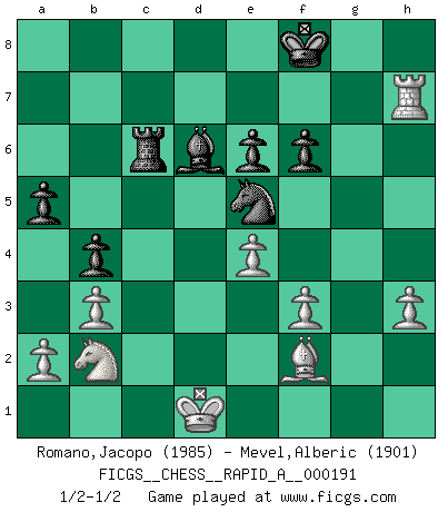 Last move : 1/2-1/2 2016 November 21 22:29:46 [Event "FICGS__CHESS__RAPID_A__000191"] [Site "FICGS"] [Date "2016.08.05"] [Round "1"] [White "Romano,Jacopo"] [Black "Mevel,Alberic"] [Result "1/2-1/2"] [WhiteElo "1985"] [BlackElo "1901"] 1.d4 d5 2.c4 e6 3.Nf3 dxc4 4.e3 a6 5.Bxc4 c5 6.O-O Nf6 7.dxc5 Bxc5 8.Qxd8+ Kxd8 9.Rd1+ Ke7 10.Be2 b6 11.Ne5 Bb7 12.Nd2 Nbd7 13.Nd3 Bd6 14.Nc4 Bc7 15.b3 Rhc8 16.Ba3+ Ke8 17.Rac1 Ne4 18.Bb4 a5 19.Be1 b5 20.Na3 b4 21.Nb5 Bb8 22.Nb2 Rxc1 23.Rxc1 Ke7 24.f3 Nd6 25.Kf1 Nxb5 26.Bxb5 Ne5 27.Bf2 f6 28.e4 g5 29.h4 gxh4 30.Ke2 h3 31.gxh3 Bd6 32.Rg1 Ba6 33.Bxa6 Rxa6 34.Rg7+ Kf8 35.Rxh7 Rc6 36.Kd1 1/2-1/2 Queen's gambit declined Kingside Castling by player White (move 6) This chess game ended in a draw. Follow this game move after move (download)I believe that Chess possesses a magic that is also a help in advanced age. A rheumatic knee is forgotten during a game of Chess and other events can seem quite unimportant in comparison with a catastrophe on the chessboard. (Vlastimil Hort) Vielleicht wirkt die Aura früherer Spieler glanzvoller als die der heutigen Spieler, aber das liegt daran, dass man kein Programm wie Fritz hatte, das einem all die Löcher in ihren Partien zeigt. (Vladimir Kramnik) Jugadores de primera clase pierden en contra de jugadores de segunda clase porque los jugadores de segunda clase a veces juegan una partida de primer clase. (Siegbert Tarrasch) C'est la seule position que je connaisse où les deux camps sont mals. Propos prêtés à V. Anand. I would love to change the world, but they won't give me the source code. (Unknown)