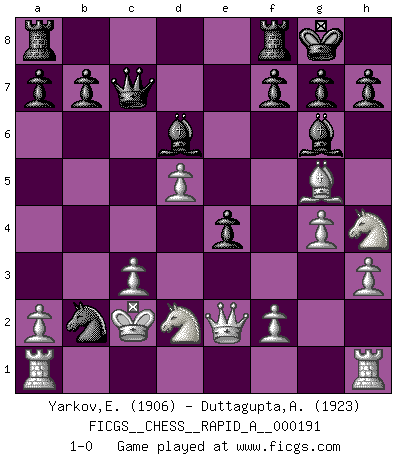 Last move : 1-0 2016 October 12 0:16:15 [Event "FICGS__CHESS__RAPID_A__000191"] [Site "FICGS"] [Date "2016.08.05"] [Round "1"] [White "Yarkov,Evgeny"] [Black "Duttagupta,Aniruddha"] [Result "1-0"] [WhiteElo "1906"] [BlackElo "1923"] 1.e4 c6 2.d4 d5 3.exd5 cxd5 4.Nf3 Nc6 5.Bd3 Bg4 6.c3 e6 7.h3 Bh5 8.Nbd2 Qc7 9.Nf1 Bd6 10.Qe2 Nf6 11.Bg5 Ne4 12.Bxe4 dxe4 13.Qxe4 O-O 14.g4 Bg6 15.Qe2 e5 16.d5 e4 17.Nh4 Ne5 18.Nd2 Nd3+ 19.Kd1 Nxb2+ 20.Kc2 1-0 This chess game has been lost on time (started : 2016.08.05 20:52:39) Caro-Kann : Exchange variation Kingside Castling by player Black (move 13) Player White won this chess game. Follow this game move after move (download)A good player is always lucky. (Jose Raul Capablanca) Der 70jährige Viktor Kortschnoi: Die Rentenanstalt wollte mich zwingen in Rente zu gehen. Meine Frau erhält jetzt eine Pension- und ich zahle weiter in die Rentenkasse ein! (Viktor Kortschnoi) En un gambito tu regalas un Peón por el bién de tomar un juego perdido. (Samuel Standige Boden) Toute estimation doit être constamment réévaluée. (Jacob Estrin) There are two types of people in this world, good and bad. The good sleep better, but the bad seem to enjoy the waking hours much more. (Woody Allen)