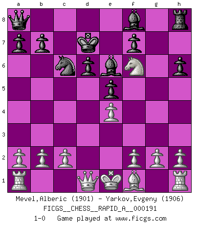 Last move : 1-0 2016 September 20 4:39:16 [Event "FICGS__CHESS__RAPID_A__000191"] [Site "FICGS"] [Date "2016.08.05"] [Round "1"] [White "Mevel,Alberic"] [Black "Yarkov,Evgeny"] [Result "1-0"] [WhiteElo "1901"] [BlackElo "1906"] 1.e4 c5 2.Nf3 Nc6 3.d4 cxd4 4.Nxd4 Nf6 5.Nc3 e5 6.Ndb5 d6 7.Bg5 h6 8.Bxf6 gxf6 9.Nd5 Be6 10.Nbc7+ Kd7 11.Nxa8 Qxa8 12.Nxf6+ 1-0 Sicilian : Pelikan (Lasker/Sveshnikov) variation Player White won this chess game. Follow this game move after move (download)It's always better to sacrifice your opponent's men. (Savielly Tartakover) Später, ... hatte ich zunehmend Erfolg in entscheidenden Partien. Vielleicht weil ich eine einfache Wahrheit erkannte: nicht nur ich hatte Angst, auch mein Gegner. (Mikhail Nekhemyevich Tal) El jugador táctico sabe que hacer cuando hay algo que hacer; mientras que el estratega sabe que hacer cuando no hay nada que hacer. (Gerald Abrahams) Il n'y a plus de joueurs du niveau de Jacob Murray dont la seule quête est le beau jeu, le plaisir de voir les pièces construire quelque chose. Sur 10 idées à la minute, 9 seront sans intérêt, la dernière s'avèrera géniale. (Christian Bauer) A generalist learns less and less about more and more until he knows nothing about everything. (Author unknown)