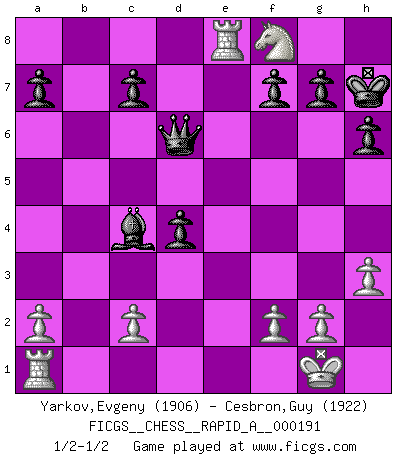 Last move : 1/2-1/2 2016 September 29 0:52:49 [Event "FICGS__CHESS__RAPID_A__000191"] [Site "FICGS"] [Date "2016.08.05"] [Round "1"] [White "Yarkov,Evgeny"] [Black "Cesbron,Guy"] [Result "1/2-1/2"] [WhiteElo "1906"] [BlackElo "1922"] 1.e4 e6 2.d4 d5 3.Nc3 Nc6 4.exd5 exd5 5.Nf3 Bb4 6.h3 Nf6 7.Bb5 O-O 8.Bxc6 bxc6 9.O-O Bxc3 10.bxc3 Ne4 11.Qd3 Re8 12.Re1 Rb8 13.c4 Qf6 14.Qe3 dxc4 15.Ne5 Nd6 16.Bd2 h6 17.Qg3 Bf5 18.Bc3 Ne4 19.Qf3 Nxc3 20.Qxc3 c5 21.Qxc4 cxd4 22.Nc6 Be6 23.Nxb8 Bxc4 24.Rxe8+ Kh7 25.Nd7 Qd6 26.Nf8+ 1/2-1/2 French : Paulsen variation Kingside Castling by player Black (move 7) Kingside Castling by player White (move 9) This chess game ended in a draw. Follow this game move after move (download)Chess is so inspiring that I do not believe a good player is capable of having an evil thought during the game. (Wilhelm Steinitz) Der zweitbeste Zug ist oft der einzig richtige. (Savielly Grigorievitsch Tartakower) El Ajedrez te enseña a controlarl la excitación inicial que sientes cuando vez algo que parece bueno y te enseña a pensar objetivamente cuando te encuentras en problemas. (Stanley Kubrick) Karpov est une pièce de musée. (Garry Kasparov) Fear is the path to the dark side. Fear leads to anger; anger leads to hate; hate leads to suffering. I sense much fear in you. (Master Yoda in Star Wars ep.1)