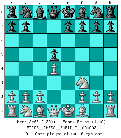 Last move : 1-0 2006 July 7 13:6:19 [Event "FICGS__CHESS__RAPID_C__000002"] [Site "FICGS"] [Date "2006.05.31"] [Round "1"] [White "Herr,Jeff"] [Black "Frank,Brian"] [Result "1-0"] [WhiteElo "1200"] [BlackElo "1400"] 1.d4 c6 2.e4 d5 3.exd5 cxd5 4.Nf3 1-0 This chess game has been lost on time (started : 2006.05.31 6:58:20) Queen's pawn Player White won this chess game. Follow this game move after move (download)Chess teaches you to control the initial excitement you feel when you see something that looks good and it trains you to think objectively when you're in trouble. (Stanley Kubrick) Ohne ihre Erfolge schmälern zu wollen würde ich sagen Petrosian, Spassky und Karpov verdanken ihre Siege ihren Trainern - Boleslavsky, Bondarevsky und Furman. (Mikhail Moiseyevich Botvinik) El Ajedrez es un cuento de Hadas de las 1001 metidas de pata. (Savielly Tartakower) La menace est plus forte que l'exécution. (Aaron Nimzovitch) In God we trust, all others we virus scan. (Anonymous)