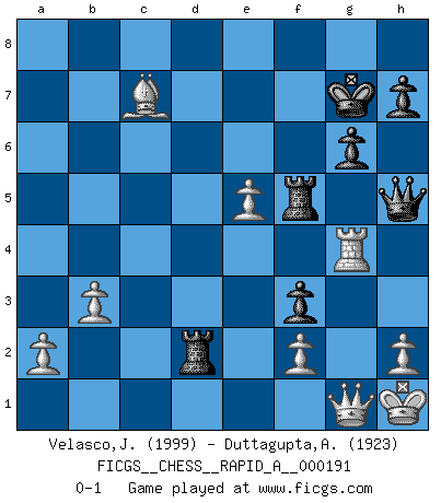 Last move : 0-1 2016 November 21 6:17:12 [Event "FICGS__CHESS__RAPID_A__000191"] [Site "FICGS"] [Date "2016.08.05"] [Round "1"] [White "Velasco,Jose Maria"] [Black "Duttagupta,Aniruddha"] [Result "0-1"] [WhiteElo "1999"] [BlackElo "1923"] 1.Nf3 f5 2.g3 Nf6 3.d4 e6 4.Bg2 Be7 5.c4 d6 6.O-O O-O 7.Nc3 a5 8.b3 Ne4 9.Bb2 Nxc3 10.Bxc3 Nd7 11.Qc2 Qe8 12.e4 f4 13.Rae1 e5 14.gxf4 exf4 15.e5 dxe5 16.Nxe5 Nxe5 17.Rxe5 Qd7 18.Be4 f3 19.Kh1 Qh3 20.Rg1 Bd6 21.Qc1 Bxe5 22.dxe5 Be6 23.Bxb7 Rad8 24.Bxa5 Rf5 25.Rg3 Qh4 26.Qg1 g6 27.Bc6 Kg7 28.Rg4 Qh5 29.Bd5 Bxd5 30.cxd5 Rxd5 31.Bxc7 Rd2 0-1 Reti v Dutch Kingside Castling by player White (move 6) Kingside Castling by player Black (move 6) Player Black won this chess game. Follow this game move after move (download)Chess is everything: art, science and sport. (Anatoly Karpov) Ich spiele ehrlich und spiele, um zu gewinnen. Wenn ich verliere nehme ich meine Medizin. (Robert James Fischer) Cuando no sepas que mover, espera por una idea que se le venga a la la cabeza de tu oponente. Tenlo por seguro de que esa idea estará incorrecta. (Siegbert Tarrasch) La menace est plus forte que l'exécution. (Aaron Nimzovitch) Unless in communicating with it one says exactly what one means, trouble is bound to result. (Alan Turing, about computers)