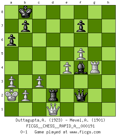Last move : 0-1 2016 December 28 21:34:21 [Event "FICGS__CHESS__RAPID_A__000191"] [Site "FICGS"] [Date "2016.08.05"] [Round "1"] [White "Duttagupta,Aniruddha"] [Black "Mevel,Alberic"] [Result "0-1"] [WhiteElo "1923"] [BlackElo "1901"] 1.e4 c5 2.Nf3 d6 3.d4 cxd4 4.Nxd4 Nf6 5.Nc3 a6 6.Be3 e6 7.g4 e5 8.Nf5 Nc6 9.Bg2 g6 10.Qe2 gxf5 11.exf5 Rg8 12.h3 h5 13.Bf3 Qa5 14.O-O-O hxg4 15.hxg4 Bd7 16.g5 e4 17.Bg2 O-O-O 18.Rhg1 d5 19.gxf6 Be8 20.Bd2 d4 21.Nb1 Nb4 22.Bxb4 Qxb4 23.a3 Bh6+ 24.Nd2 Qa5 25.Bxe4 Bb5 26.Qe1 Rge8 27.f3 d3 28.c3 Ba4 29.Kb1 Bxd1 30.Qxd1 Rd7 31.Qe1 Qb6 32.Rg2 Kb8 33.Qh4 Qe3 34.Qh2+ Bf4 35.Qh1 Qb6 36.Ka2 Qxf6 37.Kb1 Qh6 38.Qd1 Qh3 39.Rg1 Qh2 40.Nc4 d2 41.Rg4 R7d8 42.Ka2 Rxe4 43.fxe4 Qf2 44.Nxd2 Rxd2 0-1 This chess game has been lost on time (started : 2016.08.05 20:52:39) Sicilian : Najdorf, Byrne (English) attack Queenside Castling by player White (move 14) Queenside Castling by player Black (move 17) Player Black won this chess game. Follow this game move after move (download)The older I grow, the more I value Pawns. (Keres) Die Jungen erwarten, dass Opa einfach umfällt. Dann aber kann Opa fünf Stunden lang Schach spielen und die jungen Gegner an die Wand drücken. (Viktor Kortschnoi) En posiciones complicadas, Bobby Fischer pocas veces tuvo que temer de cualquiera. (Paul Keres) Vous n'êtes pas toujours obligé de jouer le meilleur coup. Un coup doit être actif, entreprenant, correct et beau ! (David Bronstein) I live to kill Traxler counterattack. (Ilmars Cirulis)