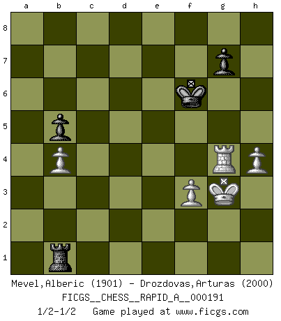 Last move : 1/2-1/2 2017 February 5 18:42:0 [Event "FICGS__CHESS__RAPID_A__000191"] [Site "FICGS"] [Date "2016.08.05"] [Round "1"] [White "Mevel,Alberic"] [Black "Drozdovas,Arturas"] [Result "1/2-1/2"] [WhiteElo "1901"] [BlackElo "2000"] 1.e4 e5 2.Nf3 Nc6 3.Bb5 a6 4.Ba4 Nf6 5.O-O Be7 6.Re1 b5 7.Bb3 O-O 8.c3 d5 9.exd5 Nxd5 10.Nxe5 Nxe5 11.Rxe5 c6 12.d4 Bd6 13.Re1 Qh4 14.g3 Qh3 15.Be3 Bg4 16.Qd3 Rae8 17.Nd2 Qh5 18.Nf1 Re6 19.a4 Bf5 20.Qd2 Bh3 21.Bd1 Qg6 22.Bf3 Qf5 23.Qe2 Rfe8 24.axb5 axb5 25.Bg2 Bxg2 26.Kxg2 Bf8 27.Rad1 Qg6 28.Kh1 Qf5 29.Qd3 Qf3+ 30.Kg1 f5 31.Qe2 Qxe2 32.Rxe2 f4 33.gxf4 Nxf4 34.Rc2 Rg6+ 35.Kh1 Nd5 36.b3 c5 37.dxc5 Nxe3 38.Nxe3 Bxc5 39.Nf5 h5 40.b4 Rg5 41.Nd4 Bb6 42.Nf3 Rf5 43.Kg2 Re4 44.h3 Ref4 45.Rd6 Rxf3 46.Rxb6 R3f4 47.Re2 Kh7 48.Rbe6 Rg5+ 49.Kf1 Rgf5 50.R6e4 Rf3 51.R4e3 R3f4 52.Kg2 Rg5+ 53.Rg3 Rgf5 54.Kg1 Kg8 55.Rge3 Rg5+ 56.Kf1 Rgf5 57.Kg2 Rg5+ 58.Kh1 R4f5 59.Kh2 Rf4 60.Rd3 Kh7 61.f3 Kg6 62.Rg2 Rxg2+ 63.Kxg2 Rc4 64.Rd6+ Kf7 65.Rd5 h4 66.Rd4 Rxc3 67.Rxh4 Kf6 68.Kg3 Rc1 69.Rf4+ Ke5 70.Rg4 Kf6 71.h4 Rb1 1/2-1/2 Ruy Lopez : Closed, 7...O-O Kingside Castling by player White (move 5) Kingside Castling by player Black (move 7) 10 pieces endgame at move 66 : White KRPPP , Black KRPPP WHITE : King + 1 Rook 3 Pawns BLACK : King + 1 Rook 3 Pawns 9 pieces endgame at move 67 : White KRPPP , Black KRPP WHITE : King + 1 Rook 3 Pawns BLACK : King + 1 Rook 2 Pawns This chess game ended in a draw. Follow this game move after move (download)Dazzling combinations are for the many, shifting wood is for the few. (Georg Kieninger) Schach ist das Spiel, das die Verrückten gesund hält. (Albert Einstein) El Ajedrez es un mar en el cual un mosquito puede beber y un elefante puede bañarse. (Refrán Hindú) Demandez au pauvre Cg1 ce qu'il en pense. Eduard Gufeld à propos de la variante Saemisch de l'Est-Indienne. A shortcut is the longest distance between two points. (Don Groves)