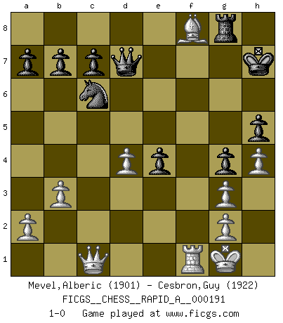 Last move : 1-0 2016 November 24 1:4:23 [Event "FICGS__CHESS__RAPID_A__000191"] [Site "FICGS"] [Date "2016.08.05"] [Round "1"] [White "Mevel,Alberic"] [Black "Cesbron,Guy"] [Result "1-0"] [WhiteElo "1901"] [BlackElo "1922"] 1.e4 e6 2.d4 d5 3.Nc3 h6 4.Nf3 Nf6 5.Bd3 Bb4 6.exd5 exd5 7.O-O O-O 8.Ne2 Nc6 9.c3 Bd6 10.Ng3 Re8 11.Nh4 Bxg3 12.fxg3 Bg4 13.Qc2 Ne4 14.Bd2 Be6 15.Rae1 Qd7 16.b3 f5 17.Bc1 g5 18.Nf3 Qd6 19.h4 g4 20.Bf4 Qd7 21.Nd2 h5 22.Qc1 Kh7 23.c4 Rac8 24.Bb1 Bf7 25.cxd5 Bxd5 26.Nxe4 Bxe4 27.Bxe4 Rxe4 28.Rxe4 fxe4 29.Bh6 Rg8 30.Bf8 1-0 French : Paulsen variation Kingside Castling by player White (move 7) Kingside Castling by player Black (move 7) Player White won this chess game. Follow this game move after move (download)My God, Bobby Fischer plays so simply. (Alexei Suetin) Um dein Spiel zu verbessern musst du zuallererst das Endspiel studieren, denn diese kann unabhängig studiert werden. Die Eröffnung und das Mittelspiel müssen immer in Bezug gesetzt werden zum Endspiel. (José Raúl Capablanca) Yo no le temo a Spassky. Todos saben que yo soy el mejor. Uno no necesita un torneo para probarlo. (Bobby Fischer) Le profane ne songe pas à la somme de jouissance dont il se prive, qui méconnaît ce jeu aux ressources aussi variées que passionnantes. (Jean-Marie Jeanton-Lamarche) Two beer, or not two beer. (Unknown)