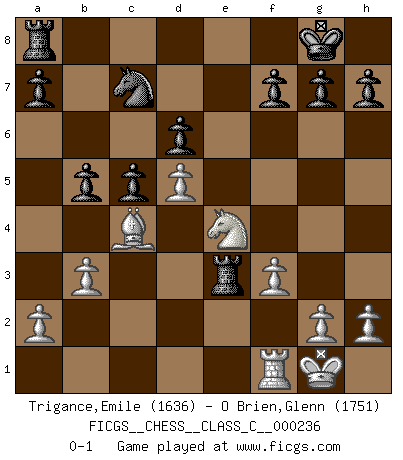 Last move : 0-1 2016 September 25 11:32:0 [Event "FICGS__CHESS__CLASS_C__000236"] [Site "FICGS"] [Date "2016.08.05"] [Round "1"] [White "Trigance,Emile"] [Black "O Brien,Glenn"] [Result "0-1"] [WhiteElo "1636"] [BlackElo "1751"] 1.d4 Nf6 2.Bg5 Ne4 3.Bf4 c5 4.f3 Qa5+ 5.c3 Nf6 6.d5 Qb6 7.b3 e6 8.e4 exd5 9.exd5 Bd6 10.Nh3 O-O 11.Qd2 Qc7 12.Be2 Nxd5 13.Bxd6 Qxd6 14.c4 Qe5 15.cxd5 Qxa1 16.O-O Qe5 17.Nc3 d6 18.Nf2 Na6 19.Bb5 Nc7 20.Bc4 Qd4 21.Qc2 Re8 22.Ne2 Qe5 23.Nc3 Bf5 24.Qd2 Qe3 25.Qxe3 Rxe3 26.Nce4 Bxe4 27.Nxe4 b5 0-1 Trompowsky attack (Ruth, Opovcensky Opening) Kingside Castling by player Black (move 10) Kingside Castling by player White (move 16) Player Black won this chess game. Follow this game move after move (download)It was clear to me that the vulnerable point of the American Grandmaster (Bobby Fischer) was in double-edged, hanging, irrational positions, where he often failed to find a win even in a won position. (Efim Geller) Der Umstand, daß uns eine 7 Stunden Zeitkontrolle ermöglicht eine großartige, tiefe Partie zu spielen, ist für die Massenmedien nicht weiter von Bedeutung. (Alexej Shirov) Al jugar al Ajedrez entonces, podemos aprender: Primero: Previsión... Segundo: Prudencia... Tercero: Cautela... Y al final, aprendemos del Ajedrez el hábito de no ser desanimados por apariencias malas presentes en el estado de nuestros asuntos, el hábito de la esperanza por una oportunidad favorable y la perseveración de los secretos de los recursos. (Benjamin Franklin) Il vaut toujours mieux jouer un plan faux de façon logique que de n'avoir pas de plan du tout. (Victor Kortchnoï) The question of whether computers can think is just like question of whether submarines can swim. (Edsger W. Dijkstra)