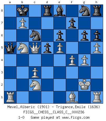 Last move : 1-0 2016 November 21 8:36:48 [Event "FICGS__CHESS__CLASS_C__000236"] [Site "FICGS"] [Date "2016.08.05"] [Round "1"] [White "Mevel,Alberic"] [Black "Trigance,Emile"] [Result "1-0"] [WhiteElo "1901"] [BlackElo "1636"] 1.e4 c6 2.d4 d5 3.e5 Bf5 4.h4 h6 5.g4 Bd7 6.h5 e6 7.f4 c5 8.c3 Nc6 9.Nf3 Be7 10.Kf2 Qb6 11.Kg2 O-O-O 12.dxc5 Bxc5 13.b4 Be3 14.a4 Bxc1 15.Qxc1 Kb8 16.a5 Qc7 17.Na3 Nce7 18.Nd4 g6 19.Qe3 a6 20.b5 Qxa5 21.bxa6 Rc8 22.Ndb5 Nc6 23.axb7 Rd8 24.Qc5 Be8 25.Nc2 1-0 Caro-Kann : Advance variation Queenside Castling by player Black (move 11) Player White won this chess game. Follow this game move after move (download)Some part of a mistake is always correct. (Savielly Tartakover) Schach ist Kampf, hauptsächlich jedoch gegen die eigenen Fehler. (Savielly Grigorievitsch Tartakower) Yo jugué Ajedrez con el y a veces le pude haber ganado solo que siempre devuelve su última jugada y juega la partida de manera diferente. (Mark Twain) 'L'échange des dames est un coup dur pour les deux adversaires...' Un journaliste lors d'une partie du match Spassky-Fischer Indecision is the key to flexibility. (Unknown)
