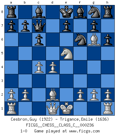 Last move : 1-0 2016 September 19 8:46:11 [Event "FICGS__CHESS__CLASS_C__000236"] [Site "FICGS"] [Date "2016.08.05"] [Round "1"] [White "Cesbron,Guy"] [Black "Trigance,Emile"] [Result "1-0"] [WhiteElo "1922"] [BlackElo "1636"] 1.e4 c6 2.d4 d5 3.Nc3 dxe4 4.Nxe4 Nd7 5.Bd3 Ndf6 6.Ng5 Qd5 7.N1f3 h6 8.c4 Qa5+ 9.Bd2 Qc7 10.Nxf7 Kxf7 11.Ne5+ Ke8 12.Bg6+ 1-0 Caro-Kann : Steinitz variation Player White won this chess game. Follow this game move after move (download)Chess is thirty to forty percent psychology. You don't have this when you play a computer. I can't confuse it. (Judith Polgar) Spielt Blackmar-Diemer-Gambit, und das Matt kommt von selbst! (Emil Joseph Diemer) No solamente yo pronostico su triunfo sobre Botvinnik, sino que me adelanto y digo que probablemente Fischer es el jugador de Ajedrez mas grande que haya existido. (John Collins) Toute estimation doit être constamment réévaluée. (Jacob Estrin) All the troubles of the world come from being unable to sit alone in a quiet room. (Blaise Pascal)