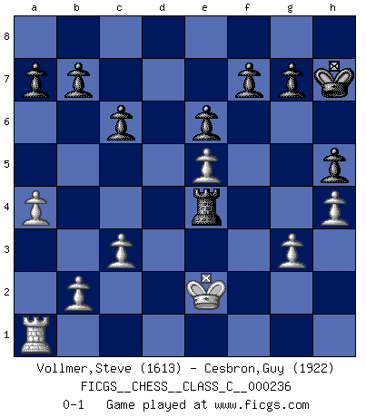 Last move : 0-1 2016 November 27 13:47:59 [Event "FICGS__CHESS__CLASS_C__000236"] [Site "FICGS"] [Date "2016.08.05"] [Round "1"] [White "Vollmer,Steve"] [Black "Cesbron,Guy"] [Result "0-1"] [WhiteElo "1613"] [BlackElo "1922"] 1.Nf3 d5 2.d4 c6 3.g3 Nf6 4.Bg2 Bf5 5.O-O e6 6.Nc3 Bd6 7.a4 Na6 8.Bg5 Nb4 9.Rc1 h6 10.Bxf6 Qxf6 11.Qd2 O-O 12.Rfe1 Bg4 13.e4 Bxf3 14.e5 Bxe5 15.dxe5 Qf5 16.Bxf3 Qxf3 17.Re3 Qg4 18.Ne4 Na2 19.Ra1 dxe4 20.Rxa2 Rfd8 21.Qe2 Qxe2 22.Rxe2 Rd4 23.c3 Rc4 24.Ra1 Rd8 25.Kg2 Rd5 26.f4 exf3+ 27.Kxf3 Kh7 28.h4 h5 29.Re4 Rd3+ 30.Re3 Rd2 31.Re2 Rxe2 32.Kxe2 Re4+ 0-1 Reti Opening Kingside Castling by player White (move 5) Kingside Castling by player Black (move 11) Player Black won this chess game. Follow this game move after move (download)No price is too great for the scalp of the enemy King. (Koblentz) Der Partner hat auch seine Existenzberechtigung. (Savielly Grigorievitsch Tartakower) Los finales de Peón son del Ajedrez lo que el cesped es del Golf. (Cecil Purdy) La vie est comme un jeu d'échecs : nous esquissons un plan, mais celui-ci est tributaire de ce que daignent faire l'adversaire aux échecs et le destin dans la vie. (Arthur Schopenhauer) Ah, beer! The cause of, and the solution to, all of life's problems. (Homer Simpson)