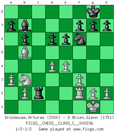 Last move : 1/2-1/2 2016 September 4 9:36:50 [Event "FICGS__CHESS__CLASS_C__000236"] [Site "FICGS"] [Date "2016.08.05"] [Round "1"] [White "Drozdovas,Arturas"] [Black "O Brien,Glenn"] [Result "1/2-1/2"] [WhiteElo "2000"] [BlackElo "1751"] 1.d4 Nf6 2.c4 e6 3.Nf3 b6 4.a3 Bb7 5.Nc3 d5 6.Bf4 Bd6 7.Bxd6 cxd6 8.e3 O-O 9.cxd5 Nxd5 10.Nxd5 Bxd5 11.Bd3 Nd7 12.e4 Bb7 13.O-O Rc8 14.Qe2 Nf6 15.Rac1 Qd7 16.Bb5 Qe7 17.Nd2 Rc7 18.f3 Rfc8 19.Rxc7 Qxc7 20.Nb3 Qc2 21.Qxc2 Rxc2 22.Rf2 1/2-1/2 Queen's Indian : Petrosian system Kingside Castling by player Black (move 8) Kingside Castling by player White (move 13) This chess game ended in a draw. Follow this game move after move (download)What is the difference between chess and football? Everybody understands football, but nobody plays it. Everybody plays chess, but nobody understands it. Everything is relative. (Vladimir Kramnik) Ohne ihre Erfolge schmälern zu wollen würde ich sagen Petrosian, Spassky und Karpov verdanken ihre Siege ihren Trainern - Boleslavsky, Bondarevsky und Furman. (Mikhail Moiseyevich Botvinik) ¿Cual es el objetivo de jugar una apertura de gambito?... Para adquirir una reputación de ser un jugador apuesto a costo de perder el juego. (Siegbert Tarrasch) Aidez vos pièces, elles vous aideront. (Paul Morphy) Some people are so afraid to die that they never begin to live. (Henry Van Dyke)