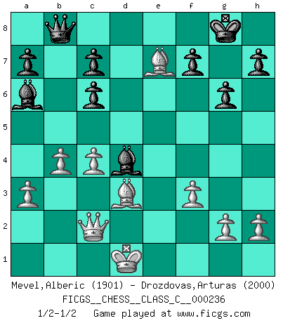 Last move : 1/2-1/2 2016 December 31 11:27:21 [Event "FICGS__CHESS__CLASS_C__000236"] [Site "FICGS"] [Date "2016.08.05"] [Round "1"] [White "Mevel,Alberic"] [Black "Drozdovas,Arturas"] [Result "1/2-1/2"] [WhiteElo "1901"] [BlackElo "2000"] 1.e4 e5 2.Nf3 Nc6 3.d4 exd4 4.Nxd4 Nf6 5.Nxc6 bxc6 6.e5 Qe7 7.Qe2 Nd5 8.c4 Ba6 9.Nd2 g6 10.Nf3 Qb4+ 11.Kd1 Rb8 12.Qc2 Ne7 13.Bd3 Bg7 14.a3 Qb7 15.Re1 O-O 16.b4 d6 17.Bg5 dxe5 18.Nxe5 Rfe8 19.Nd7 Bxa1 20.Nxb8 Qxb8 21.Rxe7 Rxe7 22.Bxe7 Bd4 23.f3 1/2-1/2 Scotch : Mieses variation Kingside Castling by player Black (move 15) This chess game ended in a draw. Follow this game move after move (download)Chess holds its master in its own bonds, shackling the mind and brain so that the inner freedom of the very strongest must suffer. (Albert Einstein) Ein Isolani verdüstert die Stimmung auf dem ganzen Schachbrett. (Savielly Grigorievitsch Tartakower) El Ajedrez es el juego mas altamente simbólico, pero las agresiones estan por lo tanto aún mas francamente representadas en la partida. Tal vez comenzo como un juego de guerra; Algo como la representación de una batalla en miniatura entre las fuerzas de dos reinos. (Karl Meninger) Le jeu d'échecs est comme rejeté hors du temps. (Antoine de Saint-Exupéry) Dave, my mind is going. I can feel it. (HAL 9000 in 2001, a space odyssey)