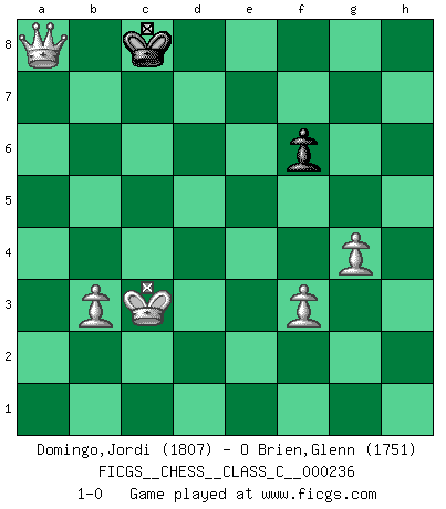 Last move : 1-0 2016 October 17 8:44:36 [Event "FICGS__CHESS__CLASS_C__000236"] [Site "FICGS"] [Date "2016.08.05"] [Round "1"] [White "Domingo,Jordi"] [Black "O Brien,Glenn"] [Result "1-0"] [WhiteElo "1807"] [BlackElo "1751"] 1.e4 e5 2.Nf3 Nc6 3.Bc4 Nf6 4.Ng5 d5 5.exd5 Na5 6.Bb5+ c6 7.dxc6 bxc6 8.Be2 h6 9.Nf3 e4 10.Ne5 Bd6 11.d4 exd3 12.Nxd3 Qc7 13.b3 O-O 14.Bb2 Ne4 15.Nc3 f5 16.h3 Ba6 17.O-O Rad8 18.Qe1 Rfe8 19.Nxe4 Rxe4 20.Qd2 c5 21.c4 Nc6 22.Bc3 Be5 23.Rae1 Bxc3 24.Qxc3 Qd6 25.Nc1 Nd4 26.Bf3 Nxf3+ 27.Qxf3 Qe7 28.Qc3 Qf6 29.Qxf6 gxf6 30.Rd1 Red4 31.Rxd4 cxd4 32.Rd1 Bb7 33.f3 Kf7 34.Ne2 d3 35.Nf4 d2 36.Kf2 Bc6 37.Ke3 Re8+ 38.Kxd2 Re5 39.Kc3 Ra5 40.Rd6 Be8 41.a4 Ke7 42.Re6+ Kf7 43.Kb4 Re5 44.Ra6 Re7 45.Nd5 Rb7+ 46.Kc3 Kg7 47.c5 Bf7 48.c6 Rb8 49.Rxa7 Rc8 50.Ne7 Rf8 51.c7 Be6 52.Nxf5+ Kh8 53.Nd6 Rg8 54.g4 h5 55.Rb7 hxg4 56.hxg4 Bd7 57.Rb8 Kh7 58.Rxg8 Kxg8 59.a5 Kf8 60.a6 Ke7 61.c8Q Bxc8 62.Nxc8+ Kd7 63.a7 Kxc8 64.a8Q+ 1-0 Two knights defense Kingside Castling by player Black (move 13) Kingside Castling by player White (move 17) 10 pieces endgame at move 58 : White KNPPPPP , Black KBP WHITE : King + 1 Knight 5 Pawns BLACK : King + 1 Bishop 1 Pawn Promotion Queen by player White (move 61) 9 pieces endgame at move 61 : White KNPPPP , Black KBP WHITE : King + 1 Knight 4 Pawns BLACK : King + 1 Bishop 1 Pawn 8 pieces endgame at move 62 : White KNPPPP , Black KP WHITE : King + 1 Knight 4 Pawns BLACK : King + 1 Pawn 7 pieces endgame at move 63 : White KPPPP , Black KP WHITE : King + 4 Pawns BLACK : King + 1 Pawn Promotion Queen by player White (move 64) Player White won this chess game. Follow this game move after move (download)Best by test: 1. e4 (Bobby Fischer) Im Hotelzimmer gab es nur zwei Schaben. (Über die Turnierbedingungen) (Peter Swidler) El poder defensivo de una pieza clavada, solamente es imaginario. (Aaron Nimzovich) Il a essayé de se convaincre qu'il pourrait empêcher toutes les erreurs et ne jamais perdre. L'horreur ! Gary Kasparov au sujet de Robert Fischer. Wisdom is the reward you get for a lifetime of listening when you'd have preferred to talk. (Doug Larson)