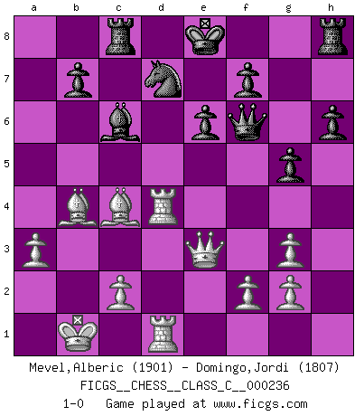 Last move : 1-0 2017 March 6 22:26:58 [Event "FICGS__CHESS__CLASS_C__000236"] [Site "FICGS"] [Date "2016.08.05"] [Round "1"] [White "Mevel,Alberic"] [Black "Domingo,Jordi"] [Result "1-0"] [WhiteElo "1901"] [BlackElo "1807"] 1.e4 h6 2.d4 c5 3.dxc5 e6 4.Be3 Nf6 5.Nc3 Qa5 6.a3 Nxe4 7.Nge2 d5 8.cxd6 Nxd6 9.Bf4 Qb6 10.Qd3 Nd7 11.O-O-O Nc5 12.Qd4 Nf5 13.Qd2 Bd7 14.Ng3 Nxg3 15.hxg3 Bc6 16.Bc4 a6 17.b4 Nd7 18.Ne4 a5 19.Nd6+ Bxd6 20.Bxd6 Qd8 21.Qe3 Qf6 22.Kb1 axb4 23.Bxb4 Rc8 24.Rh4 g5 25.Rhd4 1-0 Carr's defense Queenside Castling by player White (move 11) Player White won this chess game. Follow this game move after move (download)Nothing excites jaded Grandmasters more than a theoretical novelty. (Dominic Lawson) Später, ... hatte ich zunehmend Erfolg in entscheidenden Partien. Vielleicht weil ich eine einfache Wahrheit erkannte: nicht nur ich hatte Angst, auch mein Gegner. (Mikhail Nekhemyevich Tal) Sin errores no puede haber brillantez. (Emanuel Lasker) La vie et les Echecs sont tous les deux une lutte constante. (Lasker) In my experience, there's no such thing as luck. (Obi-Wan Kenobi in Star Wars ep.4)