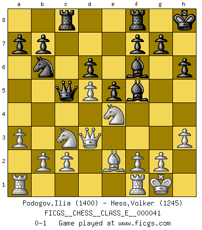 Last move : 0-1 2007 June 10 0:53:0 [Event "FICGS__CHESS__CLASS_E__000041"] [Site "FICGS"] [Date "2007.03.26"] [Round "1"] [White "Podogov,Ilia"] [Black "Hess,Volker"] [Result "0-1"] [WhiteElo "1400"] [BlackElo "1245"] 1.e4 d6 2.d4 Nf6 3.Nc3 e5 4.d5 c6 5.Nf3 Be7 6.Bd3 O-O 7.h3 Qa5 8.O-O cxd5 9.exd5 Kh8 10.Be2 Nbd7 11.Be3 Nb6 12.Bg5 h6 13.Bxf6 Bxf6 14.a3 Qc5 15.Qd3 Bd7 16.Nd2 Rac8 17.Nde4 Bf5 0-1 Pirc defense Kingside Castling by player Black (move 6) Kingside Castling by player White (move 8) Player Black won this chess game. Follow this game move after move (download)You know you're going to lose. Even when I was ahead I knew I was going to lose. - On playing against Fischer. (Andrew Soltis) Karpov ist ein Museumsstück. (Garry Kasparov) ¡Examina movidas que hagan daño! Un buen ojo for movidas desvastantes es mucho mas importante que el conocimiento de principios estratégicos. (Purdy) Les échecs sont un jeu terrible. Si vous n'avez pas le centre, votre adversaire a une position plus libre. Par contre, si vous avez le centre, alors vous avez vraiment quelque chose pour laquelle vous inquiéter ! (Siegbert Tarrasch) If we don't succeed, we run the risk of failure. (George W. Bush)