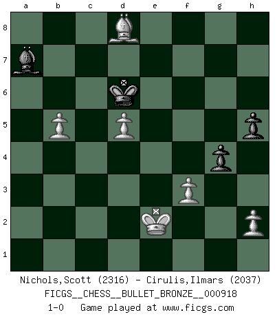 Last move : 1-0 2016 August 6 20:7:25 [Event "FICGS__CHESS__BULLET_BRONZE__000918"] [Site "FICGS"] [Date "2016.08.06"] [Round "1"] [White "Nichols,Scott"] [Black "Cirulis,Ilmars"] [Result "1-0"] [WhiteElo "2316"] [BlackElo "2037"] 1.e4 a6 2.d4 e6 3.Nf3 d5 4.Nbd2 c5 5.dxc5 Bxc5 6.Bd3 Nf6 7.O-O dxe4 8.Nxe4 Nxe4 9.Bxe4 Qxd1 10.Rxd1 Nd7 11.Ne1 O-O 12.Bxb7 Bxb7 13.Rxd7 Bc6 14.Rc7 Rac8 15.Rxc8 Rxc8 16.Be3 Be7 17.b3 f6 18.c4 Kf7 19.Rd1 a5 20.Nd3 Ba8 21.Bb6 a4 22.f3 e5 23.Kf2 e4 24.Nf4 exf3 25.gxf3 g5 26.Nd5 Ba3 27.Rd3 axb3 28.axb3 h5 29.Ba5 Bc5+ 30.Kf1 Bc6 31.b4 Ba7 32.b5 Bxd5 33.cxd5 Rc1+ 34.Ke2 Ke7 35.Rc3 Rxc3 36.Bxc3 Kd6 37.Bxf6 g4 38.Bd8 1-0 St. George (Baker) defense Kingside Castling by player White (move 7) Kingside Castling by player Black (move 11) 10 pieces endgame at move 37 : White KBPPPP , Black KBPP WHITE : King + 1 Bishop 4 Pawns BLACK : King + 1 Bishop 2 Pawns Player White won this chess game. Follow this game move after move (download)Chess is a fighting game which is purely intellectual and includes chance. (Richard Reti) Das Spiel gibt uns die Genugtuung, die das Leben uns versagt. (Emanuel Lasker) Las ideas audaces son como las piezas del Ajedrez que avanzan hacia adelante. Ellas pueden ser vencidas, pero también pueden iniciar una partida victoriosa. (Goethe) Psychologiquement, tu dois avoir confiance en toi même, mais cette confiance doit être basée sur des faits. (Robert Fischer) Perhaps chess is the wrong game for the times (The Chess Master and the Computer, by Garry Kasparov - 2010)