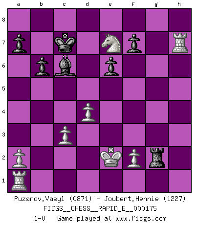 Last move : 1-0 2016 October 26 13:38:52 [Event "FICGS__CHESS__RAPID_E__000175"] [Site "FICGS"] [Date "2016.08.11"] [Round "1"] [White "Puzanov,Vasyl"] [Black "Joubert,Hennie"] [Result "1-0"] [WhiteElo "0871"] [BlackElo "1227"] 1.e4 c5 2.c3 e6 3.d4 cxd4 4.cxd4 Nf6 5.Nc3 Bb4 6.e5 Nd5 7.Bd2 Nxc3 8.bxc3 Be7 9.Bd3 O-O 10.Qh5 g6 11.Qh6 Re8 12.h4 Bf8 13.Qf4 Bg7 14.h5 d6 15.hxg6 hxg6 16.Qh2 Nc6 17.Qh7+ Kf8 18.Bh6 Bxh6 19.Qxh6+ Ke7 20.exd6+ Qxd6 21.Qg5+ Kd7 22.Rh7 Re7 23.Nf3 b6 24.Bb5 Bb7 25.Ne5+ Kc7 26.Bxc6 Bxc6 27.Nxg6 Rg8 28.Qxe7+ Qxe7 29.Nxe7 Rxg2 30.Ke2 1-0 Sicilian : Alapin's variation (2.c3) Kingside Castling by player Black (move 9) Player White won this chess game. Follow this game move after move (download)The isolated Pawn casts gloom over the entire chessboard. (Aaron Nimzovich) Zeige mir drei Eröffnungsvarianten und ich beweise dir, dass zwei davon inkorrekt sind. (Emanuel Lasker) El Ajedrez es despiadado: debes de estar preparado para matar gente. (Nigel Short) Des combinaisons [dans le jeu d'échecs] pareilles à des mélodies. Je crois entendre pour ainsi dire la musique des coups... (Vladimir Nabokov) The various flowers seem good to different people. (Chinese proverb)