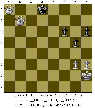 Last move : 1-0 2016 October 4 6:56:35 [Event "FICGS__CHESS__RAPID_E__000175"] [Site "FICGS"] [Date "2016.08.11"] [Round "1"] [White "Leurette,Marc-Antoine"] [Black "Pipac,Darko"] [Result "1-0"] [WhiteElo "1276"] [BlackElo "1187"] 1.e4 e5 2.Nf3 Nc6 3.Bc4 a6 4.O-O h6 5.Nc3 Bb4 6.d4 Bxc3 7.bxc3 d6 8.dxe5 dxe5 9.Ba3 Bg4 10.h3 Bxf3 11.Qxf3 Nf6 12.Rad1 Qc8 13.Bb3 b5 14.Bd5 Nxd5 15.exd5 Ne7 16.Bxe7 Kxe7 17.Rfe1 f6 18.c4 Qd7 19.c5 Rac8 20.d6+ cxd6 21.cxd6+ Kf7 22.Rxe5 Rhe8 23.Qd5+ Kf8 24.Rxe8+ Rxe8 25.c4 Re5 26.Qa8+ Kf7 27.Qxa6 bxc4 28.Qxc4+ Re6 29.a4 Ke8 30.a5 Rxd6 31.Rxd6 Qxd6 32.Qb5+ Kd8 33.a6 Kc8 34.Qb7+ Kd8 35.a7 Qd1+ 36.Kh2 Qd6+ 37.g3 Qxg3+ 38.fxg3 g5 39.a8Q+ 1-0 King's pawn game Kingside Castling by player White (move 4) 10 pieces endgame at move 37 : White KQPPP , Black KQPPP WHITE : King + 1 Queen 3 Pawns BLACK : King + 1 Queen 3 Pawns 9 pieces endgame at move 38 : White KQPPP , Black KPPP WHITE : King + 1 Queen 3 Pawns BLACK : King + 3 Pawns Promotion Queen by player White (move 39) Player White won this chess game. Follow this game move after move (download)Adequate compensation for a sacrifice is having a sound combination leading to a winning position; adequate compensation for a blunder is having your opponent snatch defeat from the jaws of victory. (Bruce A. Moon) Kasparov stellt für gewöhnlich die Regeln auf und bricht sie dann selbst wieder. (Alexej Shirov) Hay jugadores fuertes y personas amables y yo soy un jugador fuerte. (Bobby Fischer) Le jeu d'échecs est comme rejeté hors du temps. (Antoine de Saint-Exupéry) Creativity is allowing yourself to make mistakes. Art is knowing which ones to keep. (Scott Adams)