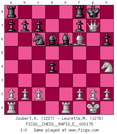 Last move : 1-0 2016 August 29 16:24:32 [Event "FICGS__CHESS__RAPID_E__000175"] [Site "FICGS"] [Date "2016.08.11"] [Round "1"] [White "Joubert,Hennie"] [Black "Leurette,Marc-Antoine"] [Result "1-0"] [WhiteElo "1227"] [BlackElo "1276"] 1.e4 e5 2.Nf3 Nc6 3.Bc4 Nf6 4.d4 exd4 5.O-O Nxe4 6.Re1 d5 7.Bxd5 Qxd5 8.Nc3 Qh5 9.Nxe4 Be6 10.Bg5 h6 11.Bf6 Qg6 12.Nh4 Qg4 13.Nd6+ Bxd6 14.Qxg4 O-O 15.Qxg7+ 1-0 Two knights defense Kingside Castling by player White (move 5) Kingside Castling by player Black (move 14) Player White won this chess game. Follow this game move after move (download)After a bad opening, there is hope for the middle game. After a bad middle game, there is hope for the endgame. But once you are in the endgame, the moment of truth has arrived. (Edmar Mednis) Die westlichen Werte sind eine Sprache, welche die Putin-Administration nicht versteht. (Garry Kasparov) Tu puedes aprender mucho mas de una partida que pierdas que de una partida ganada. Tendras que perder cientos de partidas antes de llegar a ser un buen jugador. (Jose Raul Capablanca) La conception d'un plan est le processus par lequel un joueur exploite les avantages de sa position tout en s'efforçant d'en réduire au minimum les inconvénients. Afin de garantir le succès, un plan doit toujours se fonder sur un diagnostic objectif des particularités d'une position. La conception d'un plan est d'autant plus difficile que la position est équilibrée, et grandement facilitée lorsqu'il n'existe qu'un seul plan susceptible de répondre aux exigences de la position. (Harry Golombek) I don't diet. I just don't eat as much as I'd like to. (Linda Evangelista, supermodel)