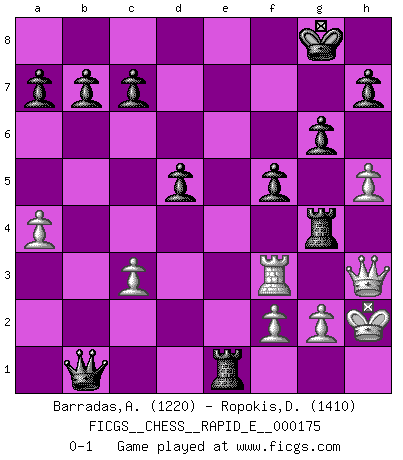 Last move : 0-1 2016 August 29 13:43:23 [Event "FICGS__CHESS__RAPID_E__000175"] [Site "FICGS"] [Date "2016.08.11"] [Round "1"] [White "Barradas,Anderson"] [Black "Ropokis,Dimitrios"] [Result "0-1"] [WhiteElo "1220"] [BlackElo "1410"] 1.e4 e5 2.Nf3 Nf6 3.Nxe5 d6 4.Nf3 Nxe4 5.d4 d5 6.Nc3 Nxc3 7.bxc3 Bd6 8.a4 O-O 9.Ba3 Bxa3 10.Rxa3 Qe7+ 11.Be2 Qxa3 12.O-O Qxc3 13.Bd3 Nc6 14.Re1 Bg4 15.Re3 Bxf3 16.Rxf3 Qxd4 17.c3 Qb6 18.Qc2 g6 19.h4 Rae8 20.Qc1 Ne5 21.Rg3 Nxd3 22.Rxd3 Re2 23.Rf3 Rfe8 24.Qf4 f5 25.h5 R8e4 26.Qg3 Rg4 27.Qh3 Re1+ 28.Kh2 Qb1 0-1 Petrov : Classical attack Kingside Castling by player Black (move 8) Kingside Castling by player White (move 12) Player Black won this chess game. Follow this game move after move (download)Chess is a terrific way for kids to build self image and self esteem. (Saudin Robovic) Mein Name ist Rustam Kamsky. Sie haben meinen Sohn belästigt. Bereiten Sie sich aufs Sterben vor. (Rustam Kamsky) A la fecha, Fischer esta simplemente un nivel arriba de todos los mejores jugadores de Ajedrez del mundo. (John Jacobs) Demandez au pauvre Cg1 ce qu'il en pense. Eduard Gufeld à propos de la variante Saemisch de l'Est-Indienne. Live, lose, and learn, by observing your opponent how to win. (Amber Steenbock)
