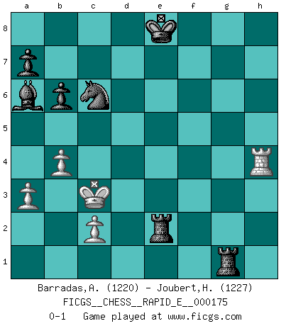 Last move : 0-1 2016 August 24 2:38:46 [Event "FICGS__CHESS__RAPID_E__000175"] [Site "FICGS"] [Date "2016.08.11"] [Round "1"] [White "Barradas,Anderson"] [Black "Joubert,Hennie"] [Result "0-1"] [WhiteElo "1220"] [BlackElo "1227"] 1.e4 c5 2.Nf3 e6 3.d4 cxd4 4.Nxd4 Nf6 5.Nc3 Qb6 6.Be3 Bc5 7.e5 Nd5 8.Na4 Qa5+ 9.Nc3 Nxc3 10.Qd2 Bb4 11.Nb3 Qxe5 12.f4 Qxe3+ 13.Qxe3 Nd5 14.Qd2 Bxd2+ 15.Nxd2 Nxf4 16.O-O-O Nc6 17.g3 Nd5 18.Ne4 O-O 19.h4 f5 20.Ng5 h6 21.Nf3 Ne3 22.Re1 Nxf1 23.Rhxf1 d5 24.Nd2 Bd7 25.Nb3 Rae8 26.Nc5 Bc8 27.a3 b6 28.Nd3 e5 29.b4 e4 30.Nf4 g5 31.hxg5 hxg5 32.Nxd5 Ba6 33.Rf2 Bc4 34.Ne3 Ba6 35.Nd5 Re5 36.Nc3 e3 37.Rf3 f4 38.gxf4 gxf4 39.Rg1+ Kf7 40.Rxf4+ Ke8 41.Rh4 e2 42.Kd2 Rf1 43.Nxe2 Rxe2+ 44.Kc3 Rxg1 0-1 Sicilian : Anderssen variation Queenside Castling by player White (move 16) Kingside Castling by player Black (move 18) Player Black won this chess game. Follow this game move after move (download)With or without the title, Bobby Fischer was unquestionably the greatest player of his time. (Burt Hochberg) Im Schach gewinnt jeder. Hat man Freunde am Spiel - und das ist die Hauptsache - ist auch der Verlust einer Partie kein Unglück. (David Bronstein) En manos de Fischer's, una diminuta ventaja teórica es tan buena como tener una Reina de ventaja. (Isaac Kashdan) Karpov est une pièce de musée. (Garry Kasparov) A good player is always lucky. (Capablanca)