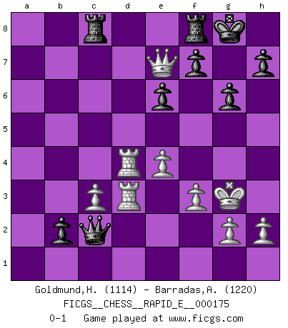 Last move : 0-1 2016 September 4 18:45:38 [Event "FICGS__CHESS__RAPID_E__000175"] [Site "FICGS"] [Date "2016.08.11"] [Round "1"] [White "Goldmund,Heike"] [Black "Barradas,Anderson"] [Result "0-1"] [WhiteElo "1114"] [BlackElo "1220"] 1.d4 d5 2.Bf4 Nc6 3.e3 Nf6 4.Nd2 Bf5 5.Bb5 Bd7 6.Ngf3 a6 7.Bd3 g6 8.c4 dxc4 9.Bxc4 Bg7 10.Qb3 O-O 11.Ne5 Nxe5 12.Bxe5 b5 13.Be2 Be6 14.Qc3 Nd5 15.Qc2 Nb4 16.Qb1 Bf5 17.e4 Bxe5 18.dxe5 Be6 19.a3 Nc6 20.Qc2 Nxe5 21.O-O c5 22.Rad1 Qc7 23.Nf3 Bg4 24.Nxe5 Bxe2 25.Qxe2 Qxe5 26.Rd5 Qc7 27.Rc1 c4 28.Rcd1 e6 29.Rd7 Qe5 30.f3 Qc5+ 31.Kf1 Rac8 32.Qc2 a5 33.Qc3 b4 34.axb4 axb4 35.Qf6 c3 36.bxc3 Qc4+ 37.R1d3 b3 38.R7d4 Qa6 39.Kf2 Qa2+ 40.Kg3 Qc2 41.Qe7 b2 0-1 Queen's pawn, Mason variation Kingside Castling by player Black (move 10) Kingside Castling by player White (move 21) Player Black won this chess game. Follow this game move after move (download)Those who say they understand Chess, understand nothing. (Robert Hubner) Wenn Du absolut nicht mehr weißt, was Du tun sollst, dann ist es Zeit für Panik. (John van der Wiel) La pasion por jugar al Ajedrez es una de las mas inexplicables en el mundo. (H.G. Wells) La vie et les Echecs sont tous les deux une lutte constante. (Lasker) Internet: Absolute communication, absolute isolation. (Paul Carvel)