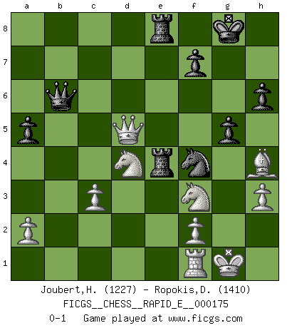 Last move : 0-1 2016 August 30 14:1:53 [Event "FICGS__CHESS__RAPID_E__000175"] [Site "FICGS"] [Date "2016.08.11"] [Round "1"] [White "Joubert,Hennie"] [Black "Ropokis,Dimitrios"] [Result "0-1"] [WhiteElo "1227"] [BlackElo "1410"] 1.e4 e5 2.Nf3 Nf6 3.Nxe5 d6 4.Nf3 Nxe4 5.c3 d5 6.d4 Bd6 7.Bd3 O-O 8.O-O Nf6 9.h3 Re8 10.Bg5 c5 11.dxc5 Bxc5 12.Nbd2 h6 13.Bh4 Nbd7 14.Bb5 a6 15.Ba4 b5 16.Bb3 Qb6 17.Bc2 a5 18.Nb3 Bd6 19.Qd3 b4 20.Nbd4 Ba6 21.Qd2 Bxf1 22.Rxf1 Ne4 23.Bxe4 Rxe4 24.Qd3 Nc5 25.Qd2 Rae8 26.Nf5 Bf4 27.Qxd5 bxc3 28.bxc3 g6 29.N5d4 Nd3 30.g3 g5 31.gxf4 Nxf4 0-1 Petrov's defense Kingside Castling by player Black (move 7) Kingside Castling by player White (move 8) Player Black won this chess game. Follow this game move after move (download)A thorough understanding of the typical mating continuations makes the most complicated sacrificial combinations leading up to them not only not difficult, but almost a matter of course. (Siegbert Tarrasch) Unter Putin wird alles Geld aus Russland wie von einem Staubsauger nach Moskau umgeleitet, das ist wie ein schwarzes Loch. (Garry Kasparov) Alguna parte de un error es siempre correcto. (Savielly Tartakover) Lorsque vous vous retrouvez devant une position atroce, ne tendez pas un ultime piège dérisoire avec l'intention d'abandonner si l'adversaire le déjoue ! Faites-vous plutôt un devoir de résister comme si votre vie en dépendait. Jouez le coup qui vous déplairait au centuple si vous étiez dans la peau de votre tortionnaire ! Remember : Your focus determines your reality. (Qui-Gon Jinn in Star Wars ep.1)