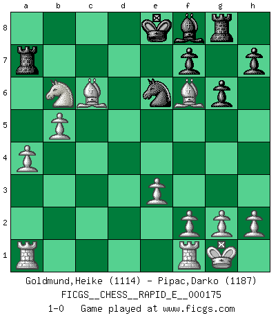 Last move : 1-0 2016 September 1 18:37:33 [Event "FICGS__CHESS__RAPID_E__000175"] [Site "FICGS"] [Date "2016.08.11"] [Round "1"] [White "Goldmund,Heike"] [Black "Pipac,Darko"] [Result "1-0"] [WhiteElo "1114"] [BlackElo "1187"] 1.b4 e5 2.Bb2 Nc6 3.b5 Nd4 4.e3 Ne6 5.Bxe5 Nf6 6.Nf3 b6 7.c4 Bb7 8.Be2 c5 9.d3 Bxf3 10.Bxf3 d5 11.O-O a6 12.Bb2 axb5 13.cxb5 Ra5 14.a4 g6 15.Nd2 c4 16.dxc4 dxc4 17.Nxc4 Ra7 18.Qxd8+ Nxd8 19.Bxf6 Rg8 20.Nxb6 Ne6 21.Bc6+ 1-0 Polish (Sokolsky) opening Kingside Castling by player White (move 11) Player White won this chess game. Follow this game move after move (download)Chess, like love, is infectious at any age. (Flohr) Den Ruhm habe ich schon, jetzt brauche ich noch das Geld. (Wilhelm Steinitz) Debió haber existido una vez en que los hombres eran semidióses, de otra manera no hubiesen podido inventar el Ajedrez. (Gustav Schenk) 'L'échange des dames est un coup dur pour les deux adversaires...' Un journaliste lors d'une partie du match Spassky-Fischer Programming can only do so much before it becomes too much. (Don Groves)