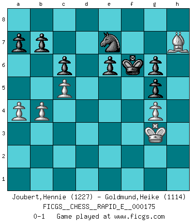 Last move : 0-1 2016 September 7 8:27:17 [Event "FICGS__CHESS__RAPID_E__000175"] [Site "FICGS"] [Date "2016.08.11"] [Round "1"] [White "Joubert,Hennie"] [Black "Goldmund,Heike"] [Result "0-1"] [WhiteElo "1227"] [BlackElo "1114"] 1.e4 d5 2.exd5 Qxd5 3.Nc3 Qa5 4.d4 Nf6 5.Nf3 Bf5 6.Be2 e6 7.O-O c6 8.Bd2 Qc7 9.Nh4 Bg6 10.Nxg6 hxg6 11.g3 Nbd7 12.Bf4 Bd6 13.Bxd6 Qxd6 14.f4 O-O-O 15.Bf3 Nb6 16.a4 Qxd4+ 17.Qxd4 Rxd4 18.Rad1 Rxd1 19.Rxd1 Kc7 20.b3 Nbd5 21.Nxd5+ Nxd5 22.c4 Ne3 23.Rd3 Nf5 24.Kf2 Rxh2+ 25.Bg2 Nd6 26.Kg1 Rh8 27.c5 Nf5 28.b4 Rd8 29.Rxd8 Kxd8 30.Kf2 f6 31.g4 Nh4 32.Bh1 Ke7 33.Kg3 g5 34.fxg5 fxg5 35.Be4 Kf6 36.Bh7 Ng6 37.Bg8 Ne7 38.Bh7 g6 0-1 Scandinavian defense Kingside Castling by player White (move 7) Queenside Castling by player Black (move 14) Player Black won this chess game. Follow this game move after move (download)Spassky will not be psyched out by Fischer. (Mike Goodall) Die Leute spielen gegen mich seit 15 Jahren unter Ihren Möglichkeiten. (Robert James Fischer) Creo que una cierta cantidad de temperamento es esperada de los genios del Ajedrez. (Ron Gross) A chaque perte on perd un peu de soi. (Joël Lautier) To err is human, to shift the blame on someone else is tactical. (Mladen Jankovic)