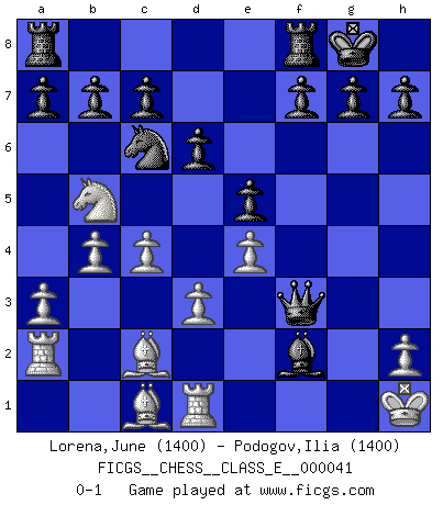 Last move : 0-1 2007 May 9 6:56:52 [Event "FICGS__CHESS__CLASS_E__000041"] [Site "FICGS"] [Date "2007.03.26"] [Round "1"] [White "Lorena,June"] [Black "Podogov,Ilia"] [Result "0-1"] [WhiteElo "1400"] [BlackElo "1400"] 1.c4 e5 2.e4 Nf6 3.Bd3 Nc6 4.a3 Bc5 5.Nc3 d6 6.Bc2 Ng4 7.Nh3 Qf6 8.O-O O-O 9.b4 Bd4 10.Qe2 Qh4 11.Ra2 Nf6 12.Nb5 Bxh3 13.gxh3 Qxh3 14.d3 Ng4 15.Qxg4 Qxg4+ 16.Kh1 Qh3 17.Rg1 Bxf2 18.Rd1 Qf3+ 0-1 English Opening Kingside Castling by player White (move 8) Kingside Castling by player Black (move 8) Player Black won this chess game. Follow this game move after move (download)Fischer wanted to give the Russians a taste of their own medicine. (Larry Evans) In der Schule lernt man nichts. Es ist nur Zeitverschwendung. (Robert James Fischer) Vive, pierde y aprende al observar a tu oponente como ganar. (Amber Steenbock) La guerre est enfant de la passion, la passion est enfant du narcissisme et le narcissisme est l'enfant. (...) Une autre partie ? (Thibault de Vassal) Big Chess is a place for big hallucinations. (Thibault de Vassal)
