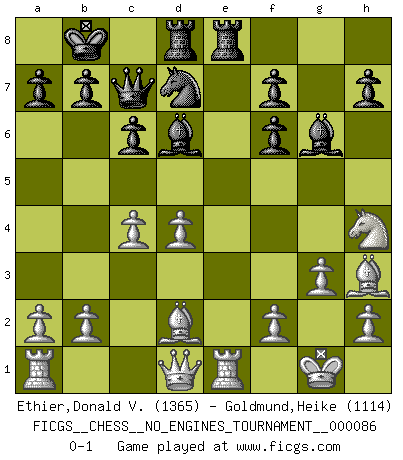 Last move : 0-1 2016 November 7 2:58:9 [Event "FICGS__CHESS__NO_ENGINES_TOURNAMENT__000086"] [Site "FICGS"] [Date "2016.08.14"] [Round "1"] [White "Ethier,Donald V."] [Black "Goldmund,Heike"] [Result "0-1"] [WhiteElo "1365"] [BlackElo "1114"] 1.e4 d5 2.exd5 Qxd5 3.Nc3 Qa5 4.d4 Nf6 5.Nf3 Bf5 6.Bc4 e6 7.Bd2 c6 8.Nd5 Qd8 9.Nxf6+ gxf6 10.O-O Qc7 11.Nh4 Bg6 12.Re1 Nd7 13.Bxe6 O-O-O 14.Bh3 Bd6 15.g3 Rhe8 16.c4 Kb8 0-1 This chess game has been lost on time (started : 2016.08.14 13:48:45) Scandinavian defense Kingside Castling by player White (move 10) Queenside Castling by player Black (move 13) Player Black won this chess game. Follow this game move after move (download)Of Chess it has been said that life is not long enough for it, but that is the fault of life, not Chess. (William Ewart Napier) Ich kenne Menschen, die allen Willen der Welt besitzen und doch nicht Schach spielen können. (Robert James Fischer) Aún deseo matar a Fischer. (Boris Spassky) Les échecs sont un jeu terrible. Si vous n'avez pas le centre, votre adversaire a une position plus libre. Par contre, si vous avez le centre, alors vous avez vraiment quelque chose pour laquelle vous inquiéter ! (Siegbert Tarrasch) Good decisions come from experience, and experience comes from bad decisions. (Anonymous)