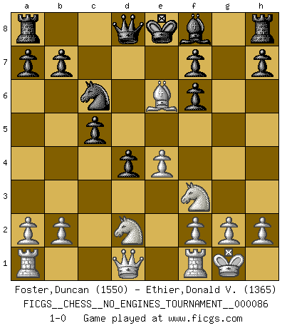 Last move : 1-0 2016 October 29 2:33:20 [Event "FICGS__CHESS__NO_ENGINES_TOURNAMENT__000086"] [Site "FICGS"] [Date "2016.08.14"] [Round "1"] [White "Foster,Duncan"] [Black "Ethier,Donald V."] [Result "1-0"] [WhiteElo "1550"] [BlackElo "1365"] 1.d4 d5 2.Bg5 Nf6 3.Bxf6 gxf6 4.c4 dxc4 5.e4 e5 6.Nf3 exd4 7.Bxc4 c5 8.O-O Be6 9.Nbd2 Nc6 10.Bxe6 1-0 This chess game has been lost on time (started : 2016.08.14 13:48:45) Levitsky attack (Queen's Bishop attack) Kingside Castling by player White (move 8) Player White won this chess game. Follow this game move after move (download)Chess holds its master in its own bonds, shackling the mind and brain so that the inner freedom of the very strongest must suffer. (Albert Einstein) Kleine Schachspieler machen Mist, und große Schachspieler machen Mist, aber große machen weniger Mist. (Fritz Sämisch) La maestría del Ajedrez consiste esencialmente en analizar posiciónes de Ajedrez con precisión. (Mikhail Botvinnik) Tout change constamment, y compris dans le monde des Echecs. (Botvinnik) The general who wins the battle makes many calculations in his temple before the battle is fought. The general who loses makes but few calculations beforehand. (Sun Tzu)