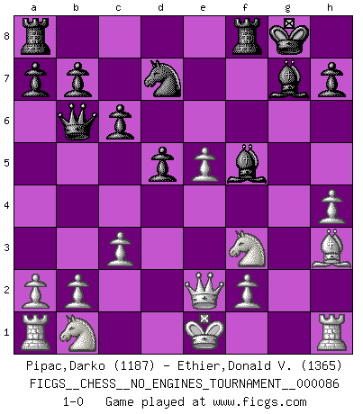 Last move : 1-0 2016 November 15 16:46:54 [Event "FICGS__CHESS__NO_ENGINES_TOURNAMENT__000086"] [Site "FICGS"] [Date "2016.08.14"] [Round "1"] [White "Pipac,Darko"] [Black "Ethier,Donald V."] [Result "1-0"] [WhiteElo "1187"] [BlackElo "1365"] 1.e4 c6 2.d4 d5 3.e5 Bf5 4.h3 e6 5.c3 Ne7 6.Nf3 Nd7 7.Bg5 f6 8.exf6 gxf6 9.Bf4 e5 10.dxe5 Ng6 11.g3 Nxf4 12.gxf4 fxe5 13.fxe5 Bg7 14.Qe2 Qb6 15.h4 O-O 16.Bh3 1-0 This chess game has been lost on time (started : 2016.08.14 13:48:45) Caro-Kann : Advance variation Kingside Castling by player Black (move 15) Player White won this chess game. Follow this game move after move (download)You must take your opponent into a deep dark forest where 2+2=5, and the path leading out is only wide enough for one. (Mikhail Tal) Das Schach hält seine Meister in eigenen Banden, Fesseln; auf vielerlei Weise formt es ihren Geist, so dass die innere Freiheit selbst des Stärksten beeinflusst wird. (Albert Einstein) Muchos se han convertido en Maestros de Ajedrez, nadie se ha convertido en el Maestro del Ajedrez. (Siegbert Tarrasch) Il n'y a pas de prix trop élevé au scalp de l'ennemi. (Koblentz) Art is the only way to run away without leaving home. (Twyla Tharp)