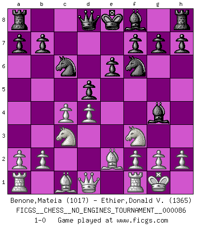 Last move : 1-0 2016 November 6 14:52:45 [Event "FICGS__CHESS__NO_ENGINES_TOURNAMENT__000086"] [Site "FICGS"] [Date "2016.08.14"] [Round "1"] [White "Benone,Mateia"] [Black "Ethier,Donald V."] [Result "1-0"] [WhiteElo "1017"] [BlackElo "1365"] 1.e4 c6 2.c4 d5 3.exd5 cxd5 4.d4 Nf6 5.Nf3 Nc6 6.Nc3 Bg4 7.Be2 e6 8.O-O 1-0 This chess game has been lost on time (started : 2016.08.14 13:48:45) Caro-Kann : Anti-anti-Caro-Kann defense Kingside Castling by player White (move 8) Player White won this chess game. Follow this game move after move (download)Nowadays, when you're not a grandmaster at 14, you can forget about it. (Anand Viswanathan) Wenn Spassky eine Figur opfert kannst du genauso gut aufgeben. Aber wenn Tal eine Figur opfert, spiel weiter. Er könnte noch eine weitere opfern, und dann ... wer weiß? (Miguel Najdorf) Aquel que toma al Peón de Caballo de la Reina, se pasará la noche a dormir en la calle. (Anónimo) Les Cavaliers se révèlent fort utiles dans les positions fermées. D'habitude, les Fous sont un peu plus forts que les Cavaliers dans les positions ouvertes. Qu'on le veuille ou non, il restera toujours des exceptions ! Patience, use the Force, think ! (Obi-Wan Kenobi in Star Wars ep.2)
